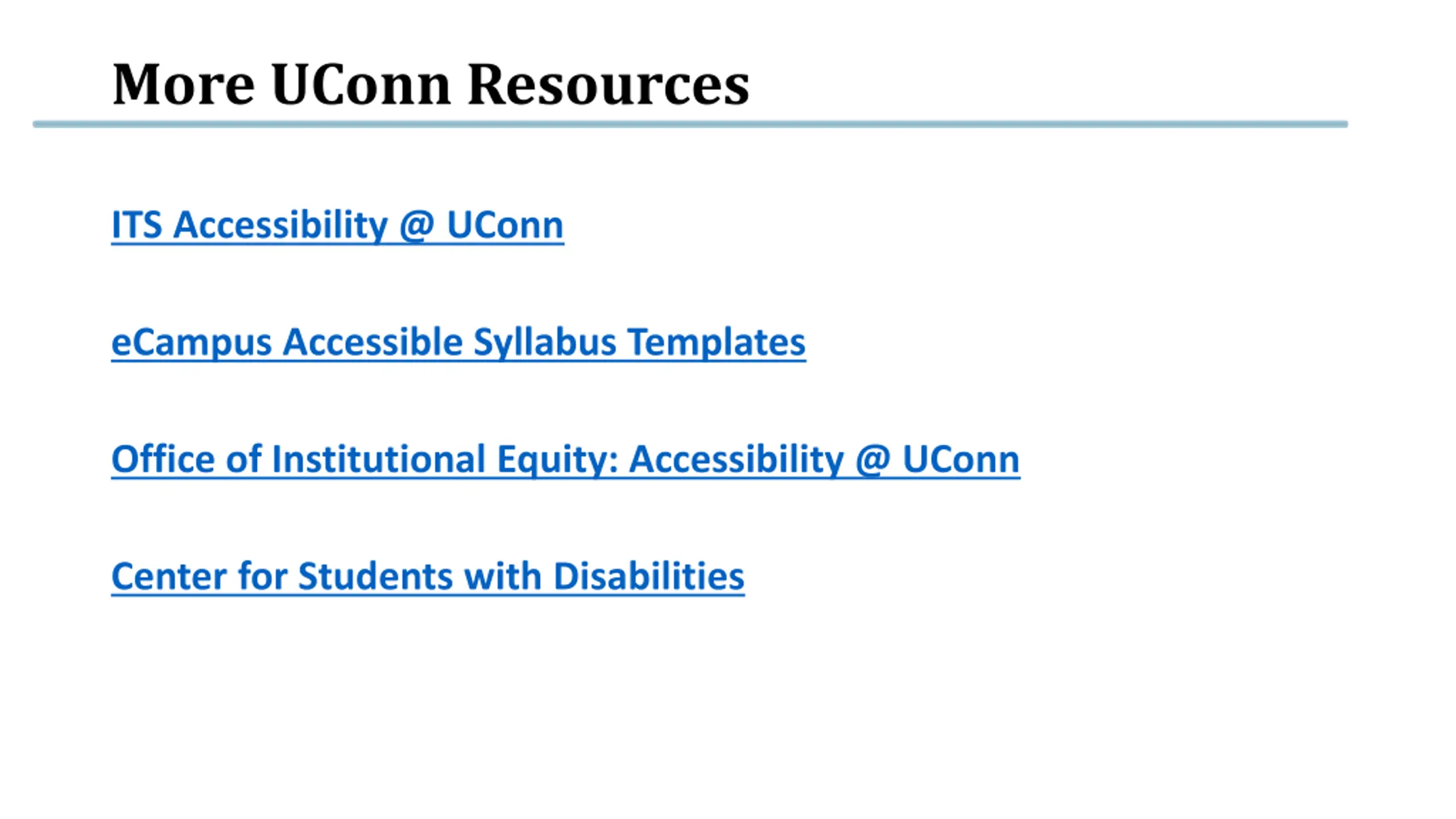 More UConn Resources ITS Accessibility @ UConn eCampus Accessible Syllabus Templates Office of Institutional Equity: Accessibility @ UConn Center for Students with Disabilities