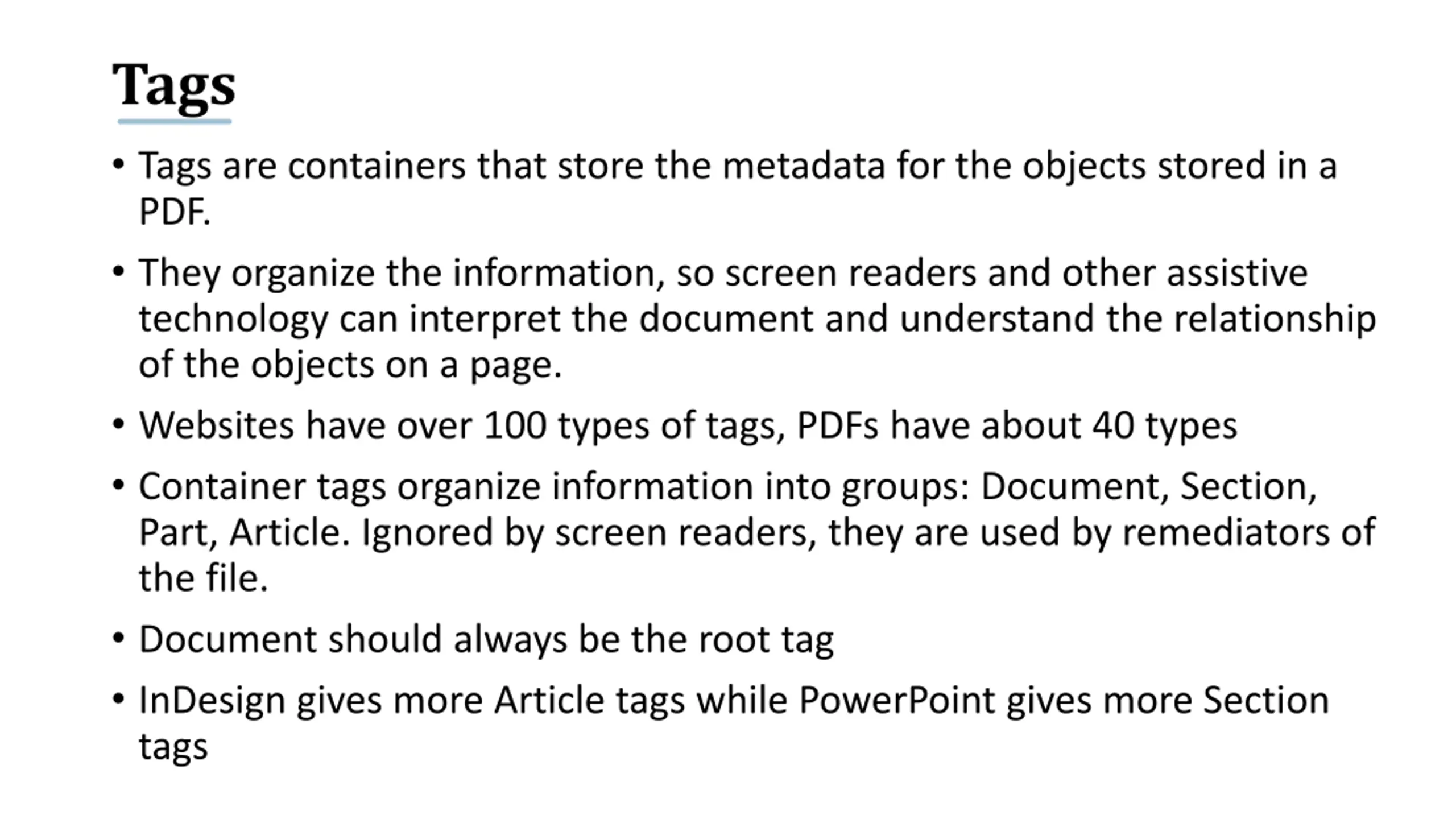 Tags Tags are containers that store the metadata for the objects stored in a PDF. They organize the information, so screen readers and other assistive technology can interpret the document and understand the relationship of the objects on a page. Websites have over 100 types of tags, PDFs have about 40 types Container tags organize information into groups: Document, Section, Part, Article. Ignored by screen readers, they are used by remediators of the file. Document should always be the root tag InDesign gives more Article tags while PowerPoint gives more Section tags