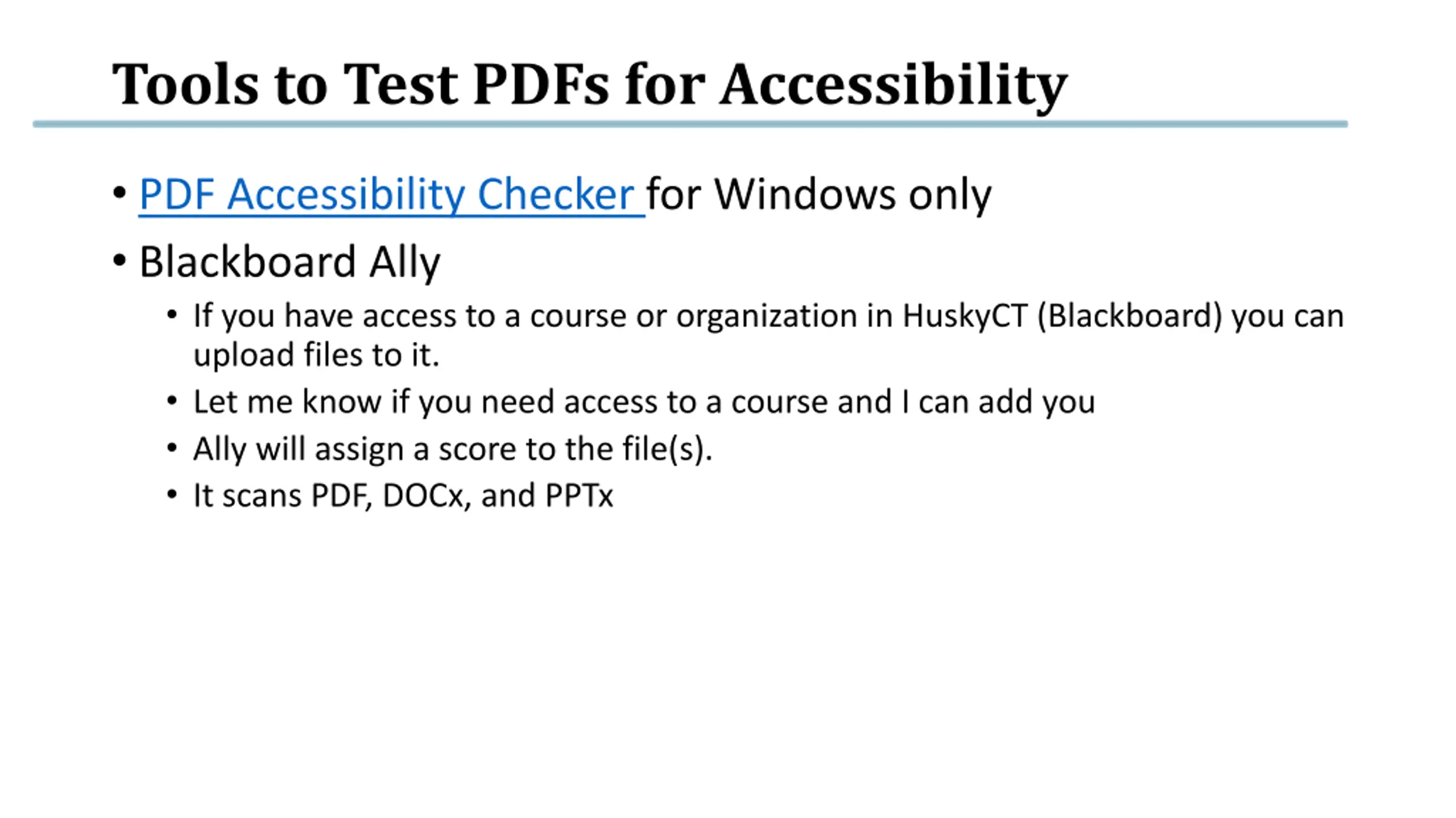 Tools to Test PDFs for Accessibility PDF Accessibility Checker for Windows only Blackboard Ally If you have access to a course or organization in HuskyCT (Blackboard) you can upload files to it. Let me know if you need access to a course and I can add you Ally will assign a score to the file(s). It scans PDF, DOCx, and PPTx