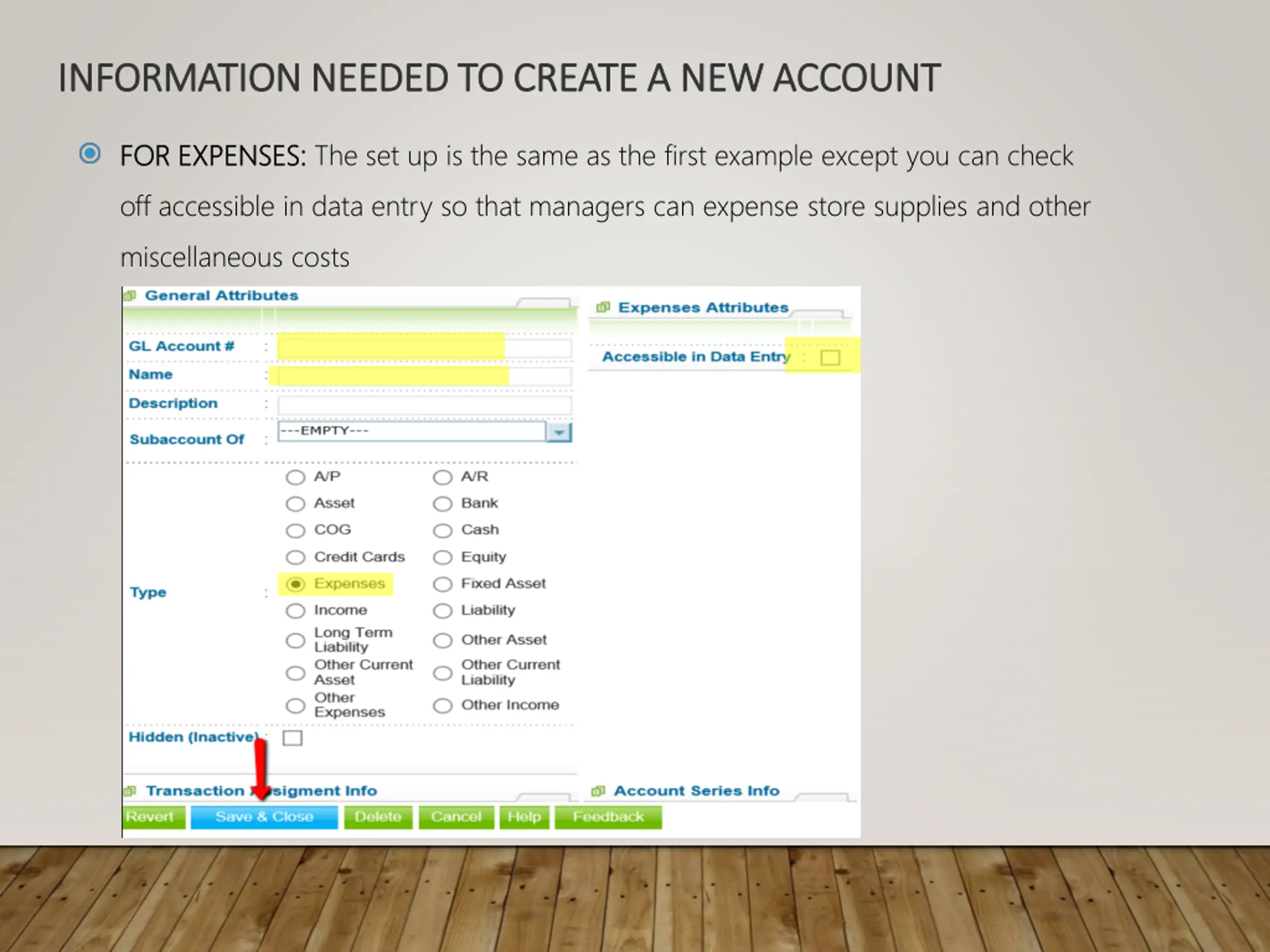 INFORMATION NEEDED TO CREATE A NEW ACCOUNT INFORMATION NEEDED TO CREATE A NEW ACCOUNT FOR EXPENSES: FOR EXPENSES: The set up is the same as the first example except you can check off accessible in data entry so that managers can expense store supplies and other miscellaneous costs