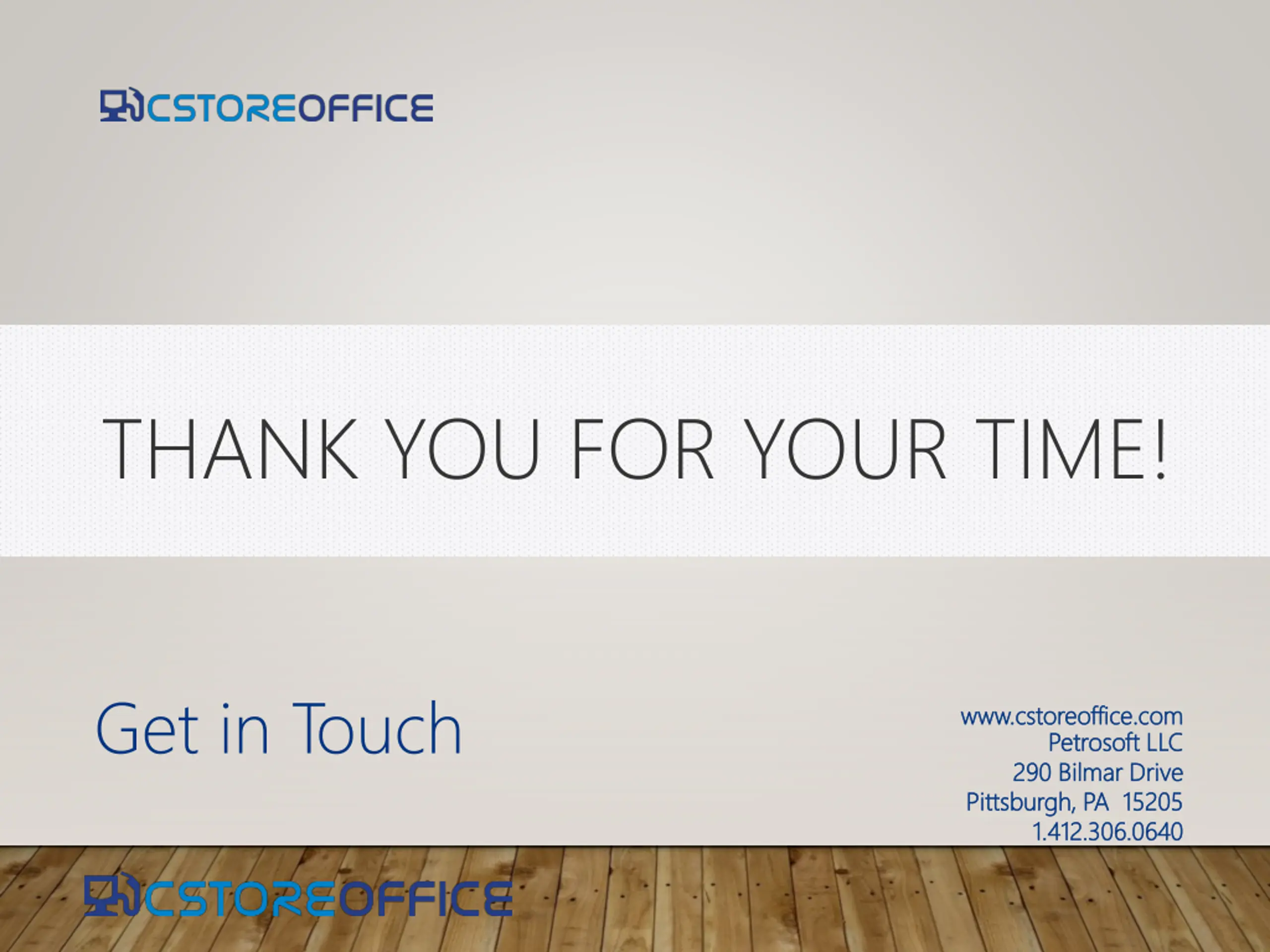 THANK YOU FOR YOUR TIME! Get in Touch www.cstoreoffice.com www.cstoreoffice.com Petrosoft Petrosoft LLC 290 290 Bilmar Bilmar Drive Pittsburgh, PA Pittsburgh, PA 15205 1.412.306.0640 1.412.306.0640 LLC Drive 15205