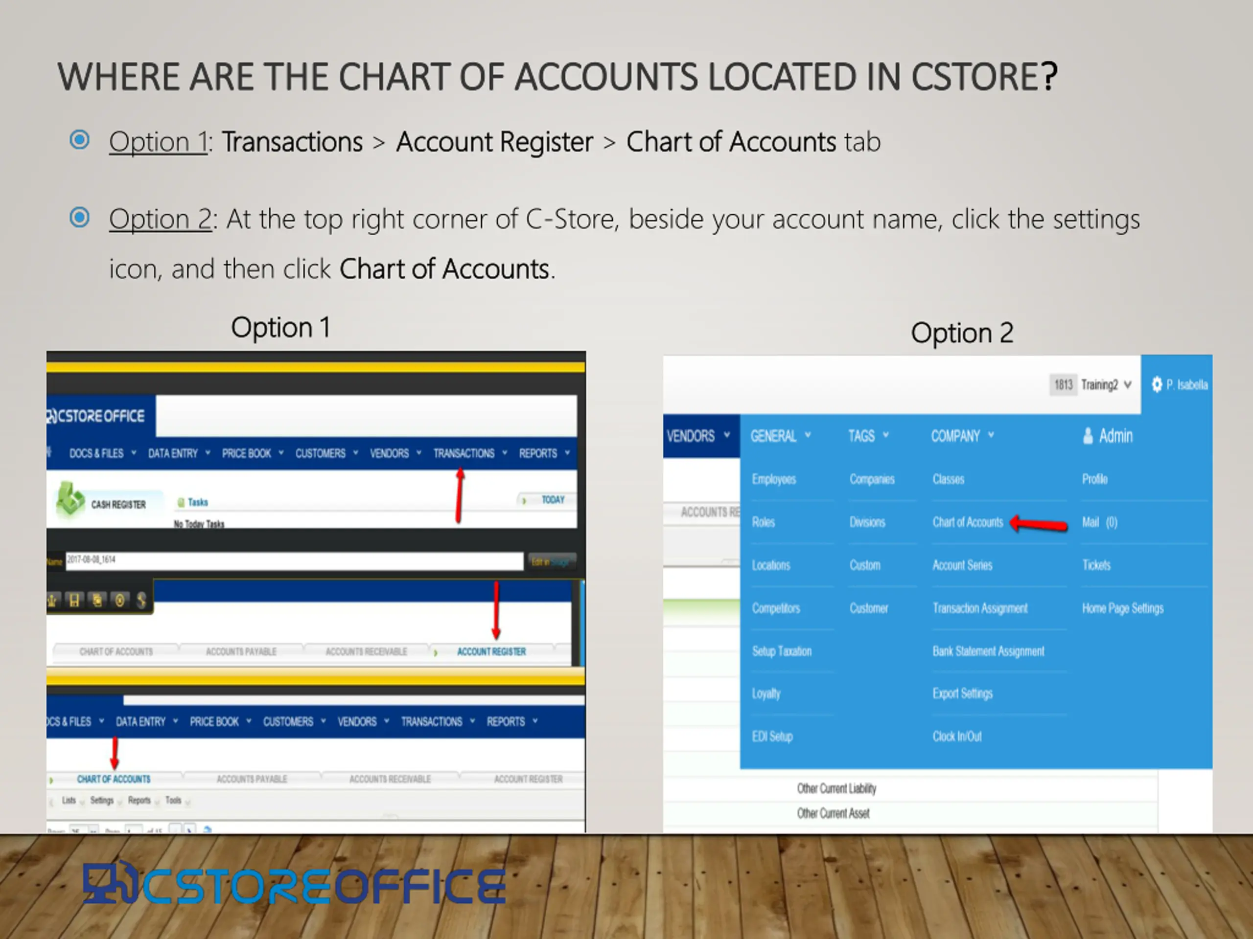 WHERE ARE THE CHART OF ACCOUNTS LOCATED IN CSTORE WHERE ARE THE CHART OF ACCOUNTS LOCATED IN CSTORE? ? Option 1: Transactions Transactions > Account Register Account Register > Chart of Accounts Chart of Accounts tab Option 2: At the top right corner of C-Store, beside your account name, click the settings icon, and then click Chart of Accounts Chart of Accounts. Option 1 Option 1 Option 2 Option 2