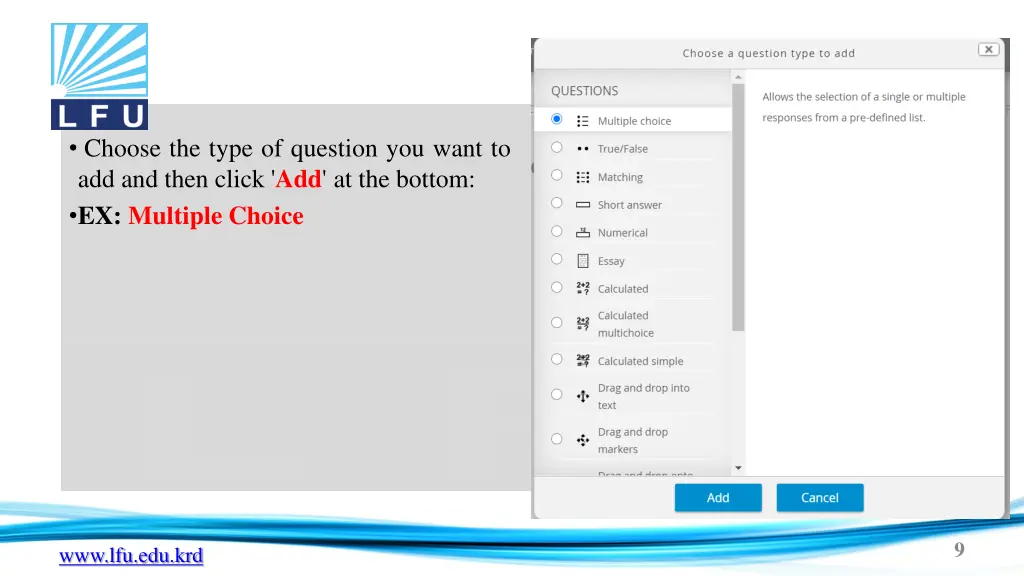 Choose the type of question you want to add and then click 'Add' at the bottom: EX: Multiple Choice 9 www.lfu.edu.krd www.lfu.edu.krd