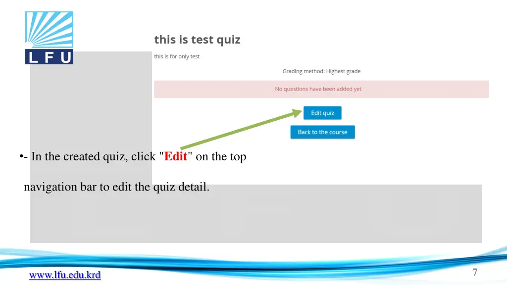 - In the created quiz, click "Edit" on the top navigation bar to edit the quiz detail. 7 www.lfu.edu.krd www.lfu.edu.krd