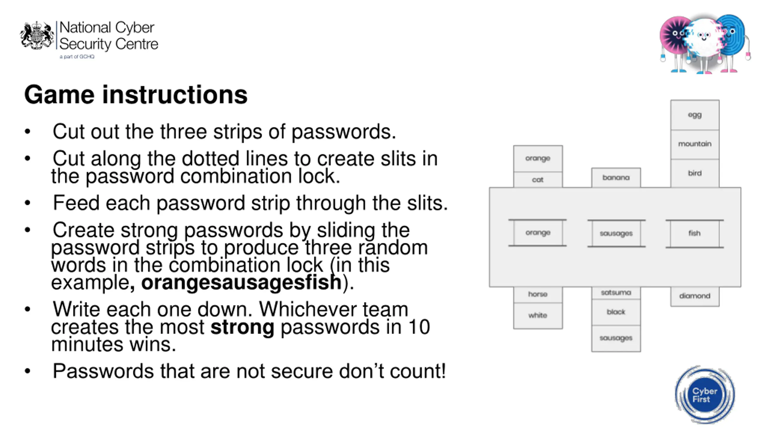 Game instructions Cut out the three strips of passwords. Cut along the dotted lines to create slits in the password combination lock. Feed each password strip through the slits. Create strong passwords by sliding the password strips to produce three random words in the combination lock (in this example, orangesausagesfish). Write each one down. Whichever team creates the most strong passwords in 10 minutes wins. Passwords that are not secure don t count!