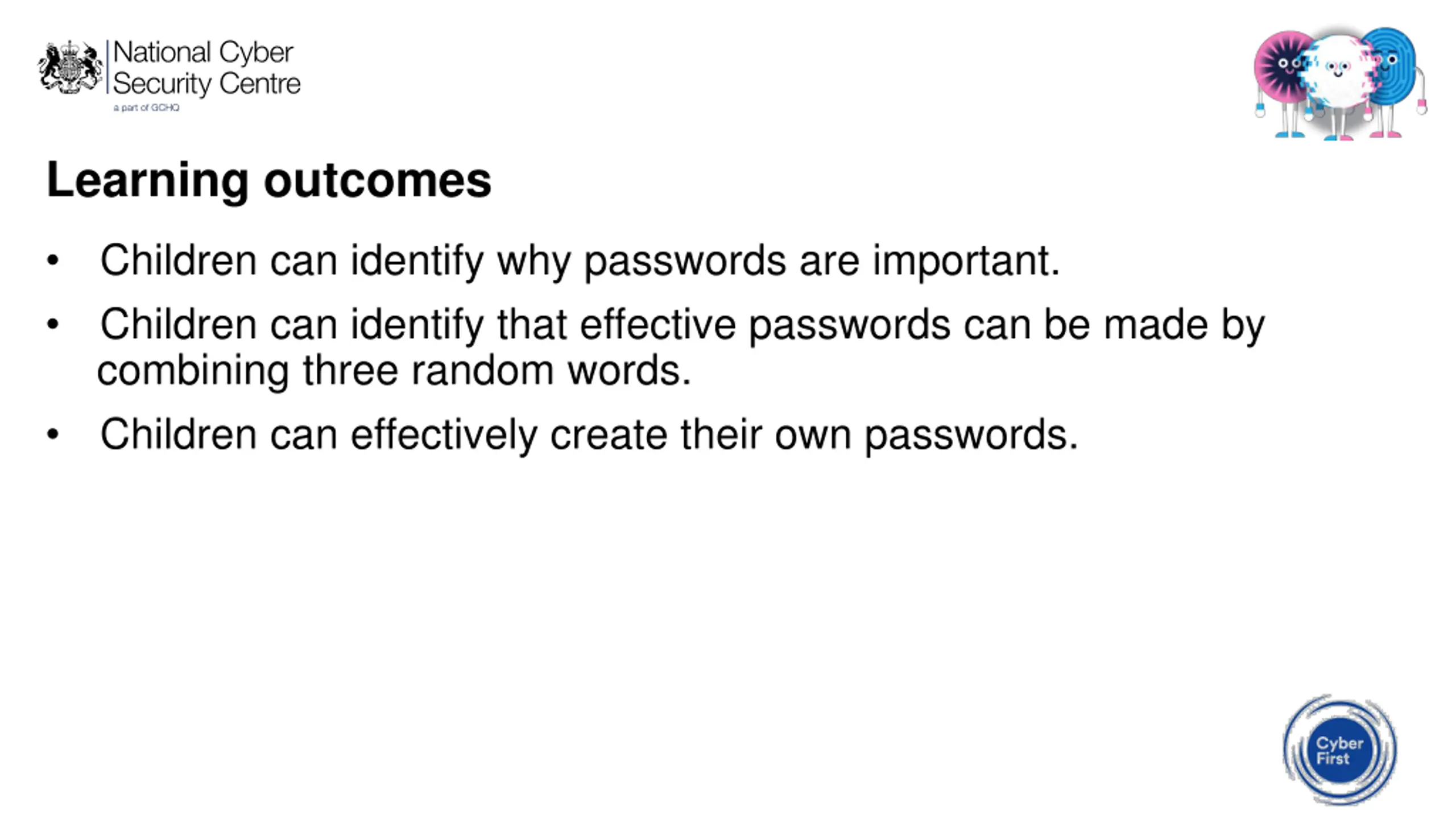 Learning outcomes Children can identify why passwords are important. Children can identify that effective passwords can be made by combining three random words. Children can effectively create their own passwords.