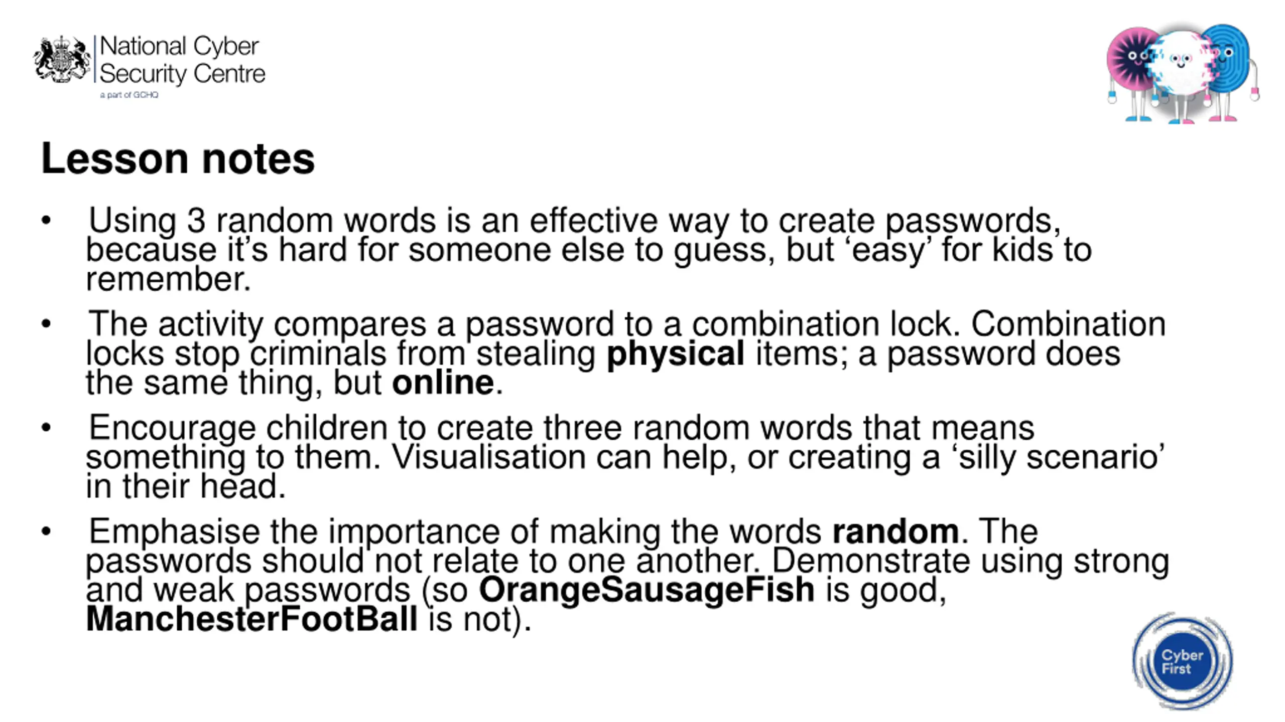 Lesson notes Using 3 random words is an effective way to create passwords, because it s hard for someone else to guess, but easy for kids to remember. The activity compares a password to a combination lock. Combination locks stop criminals from stealing physical items; a password does the same thing, but online. Encourage children to create three random words that means something to them. Visualisation can help, or creating a silly scenario in their head. Emphasise the importance of making the words random. The passwords should not relate to one another. Demonstrate using strong and weak passwords (so OrangeSausageFish is good, ManchesterFootBall is not).