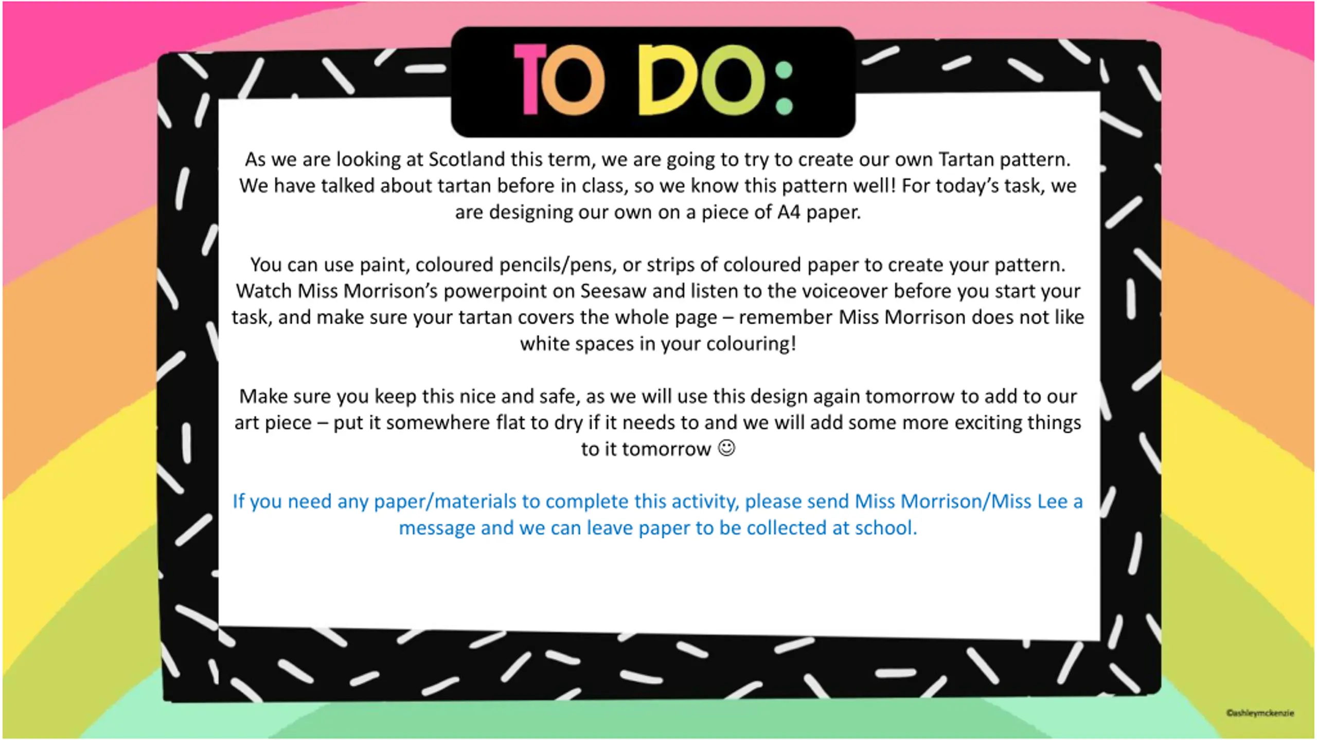- As we are looking at Scotland this term, we are going to try to create our own Tartan pattern. We have talked about tartan before in class, so we know this pattern well! For today s task, we are designing our own on a piece of A4 paper. You can use paint, coloured pencils/pens, or strips of coloured paper to create your pattern. Watch Miss Morrison s powerpoint on Seesaw and listen to the voiceover before you start your task, and make sure your tartan covers the whole page remember Miss Morrison does not like white spaces in your colouring! Make sure you keep this nice and safe, as we will use this design again tomorrow to add to our art piece put it somewhere flat to dry if it needs to and we will add some more exciting things to it tomorrow If you need any paper/materials to complete this activity, please send Miss Morrison/Miss Lee a message and we can leave paper to be collected at school.