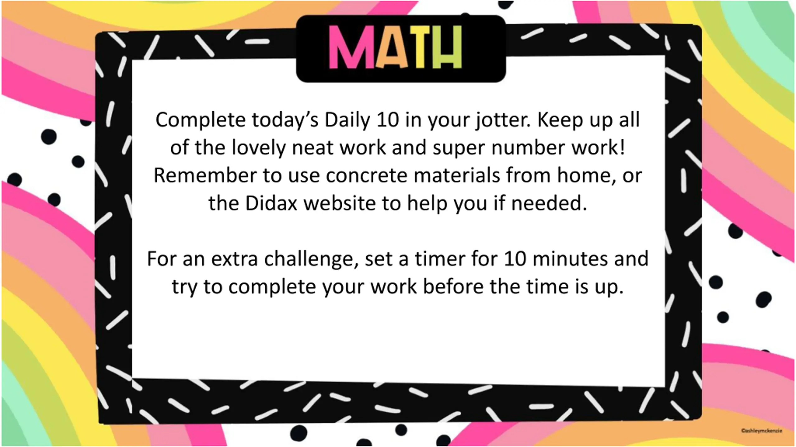 - Complete todays Daily 10 in your jotter. Keep up all of the lovely neat work and super number work! Remember to use concrete materials from home, or the Didax website to help you if needed. For an extra challenge, set a timer for 10 minutes and try to complete your work before the time is up.