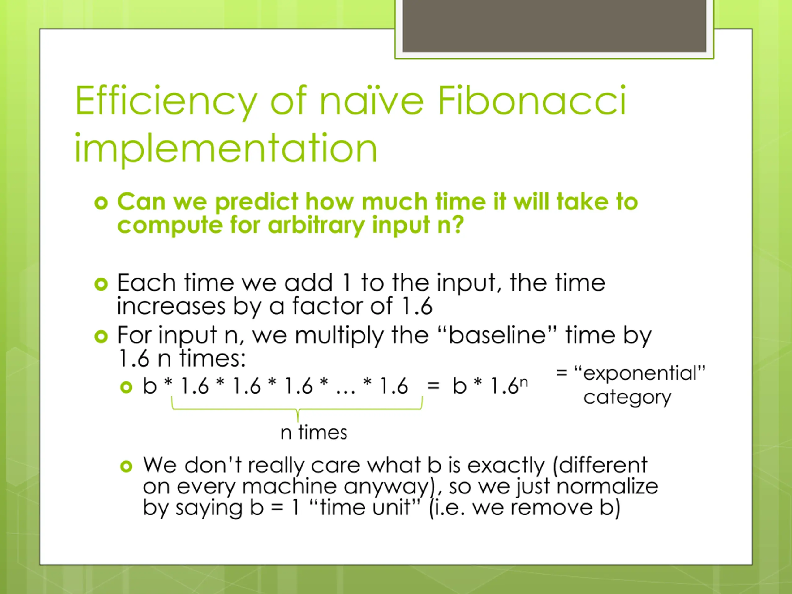 Efficiency of nave Fibonacci implementation Can we predict how much time it will take to compute for arbitrary input n? Each time we add 1 to the input, the time increases by a factor of 1.6 For input n, we multiply the baseline time by 1.6 n times: b * 1.6 * 1.6 * 1.6 * * 1.6 n times