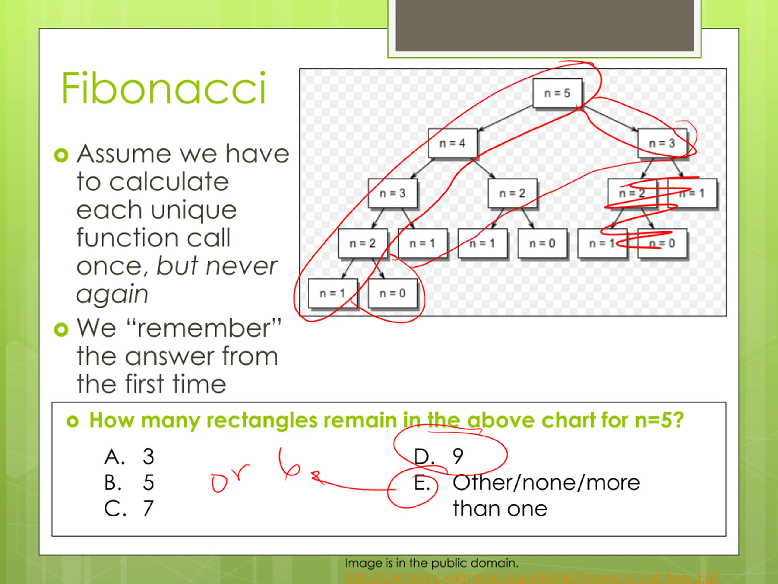 Fibonacci Assume we have to calculate each unique function call once, but never again We remember the answer from the first time How many rectangles remain in the above chart for n=5? A. 3 B. 5 C. 7 D. 9 E. Other/none/more than one Image is in the public domain. http://commons.wikimedia.org/wiki/File:Fibonacci_call_tree_5.gif