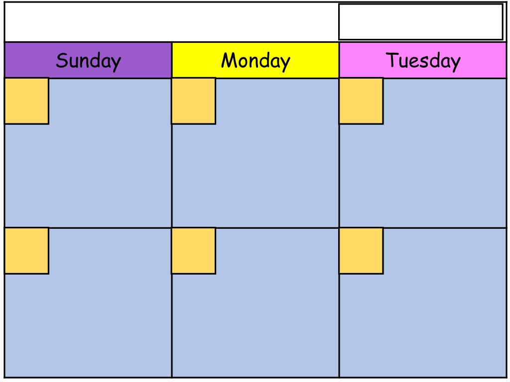 MED Monthly calendar template Saturday Paste calendar together in order of days Sun-Sat then Paste the remaining blue squares until you have a large calendar 7x5 Laminate and put soft velcro in the middle of the orange squares, middle of the blue squares and in the middle of the white rectangle (above Tuesday) This document is released under Creative Commons License Attribution 4.0 International. Please feel free to share and adapt this document with appropriate credit to Giant Steps School.