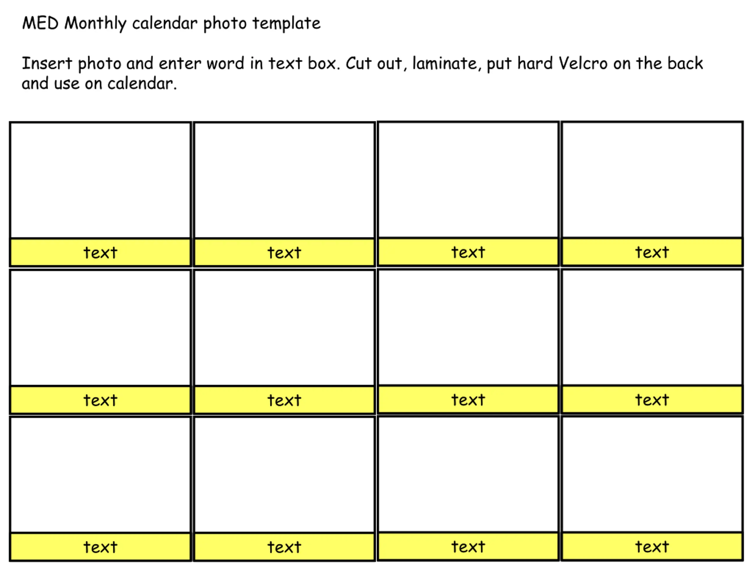 MED Monthly calendar photo template Insert photo and enter word in text box. Cut out, laminate, put hard Velcro on the back and use on calendar. text text text text text text text text text text text text
