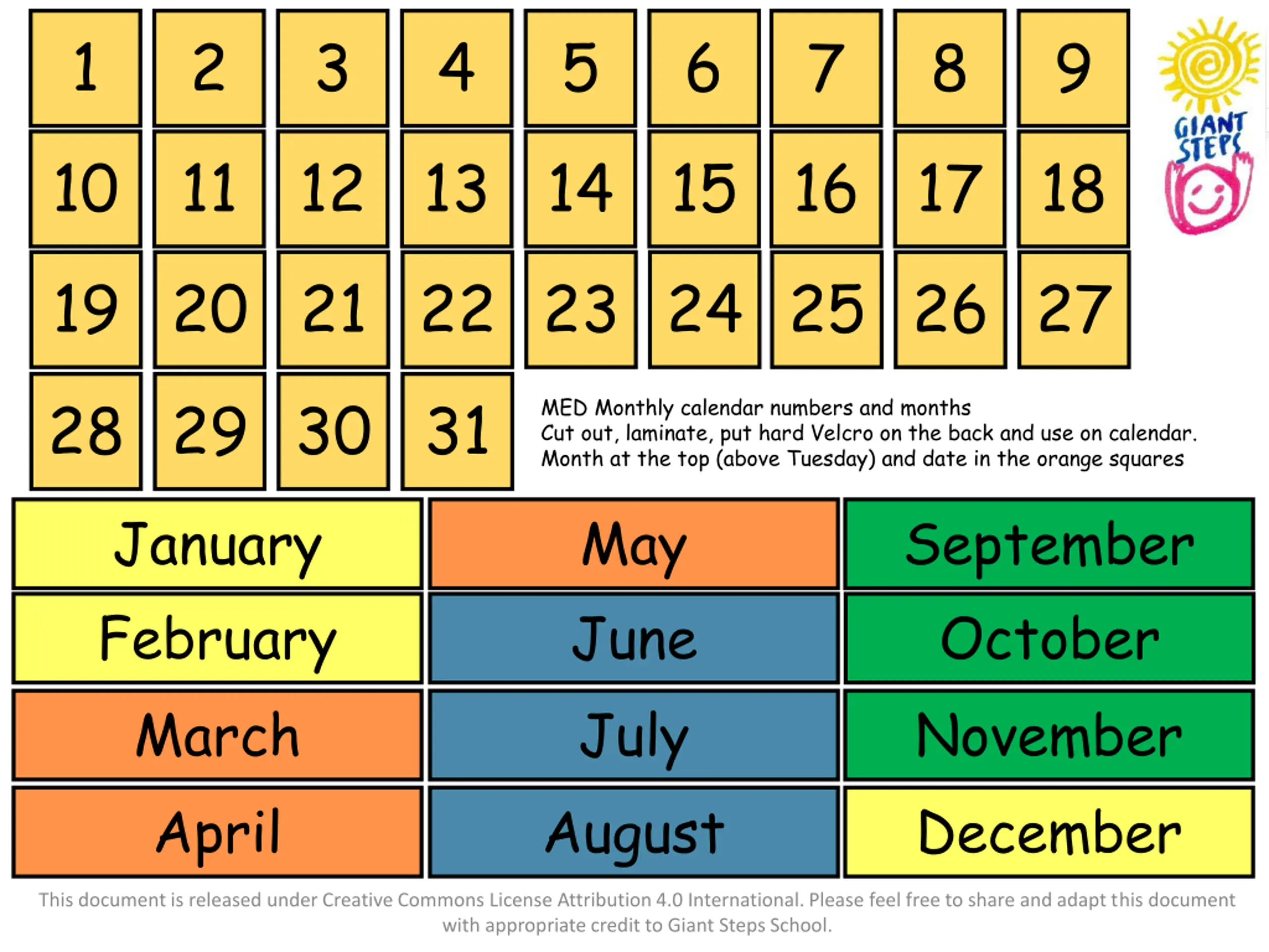 1 2 3 4 5 6 7 8 9 10 11 12 13 14 15 16 17 18 19 20 21 22 23 24 25 26 27 28 29 30 31 MED Monthly calendar numbers and months Cut out, laminate, put hard Velcro on the back and use on calendar. Month at the top (above Tuesday) and date in the orange squares January February March April May June July August September October November December This document is released under Creative Commons License Attribution 4.0 International. Please feel free to share and adapt this document with appropriate credit to Giant Steps School.