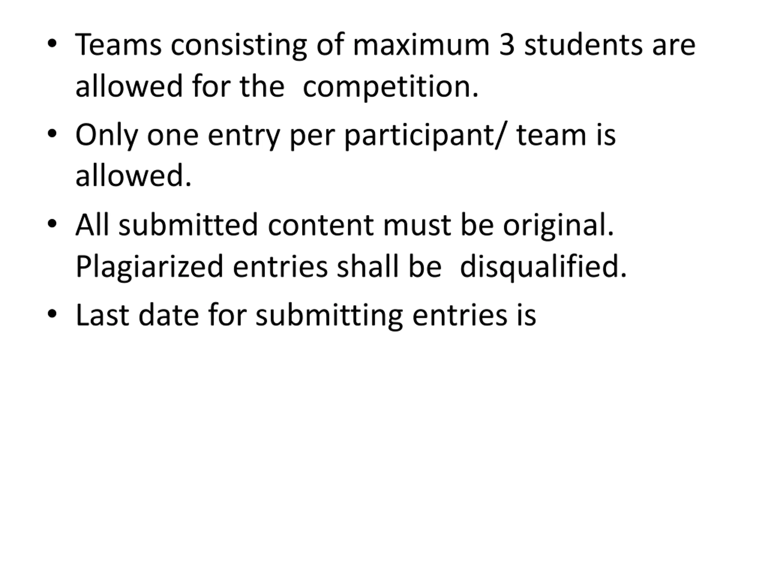 Teams consisting of maximum 3 students are allowed for the competition. Only one entry per participant/ team is allowed. All submitted content must be original. Plagiarized entries shall be disqualified. Last date for submitting entries is