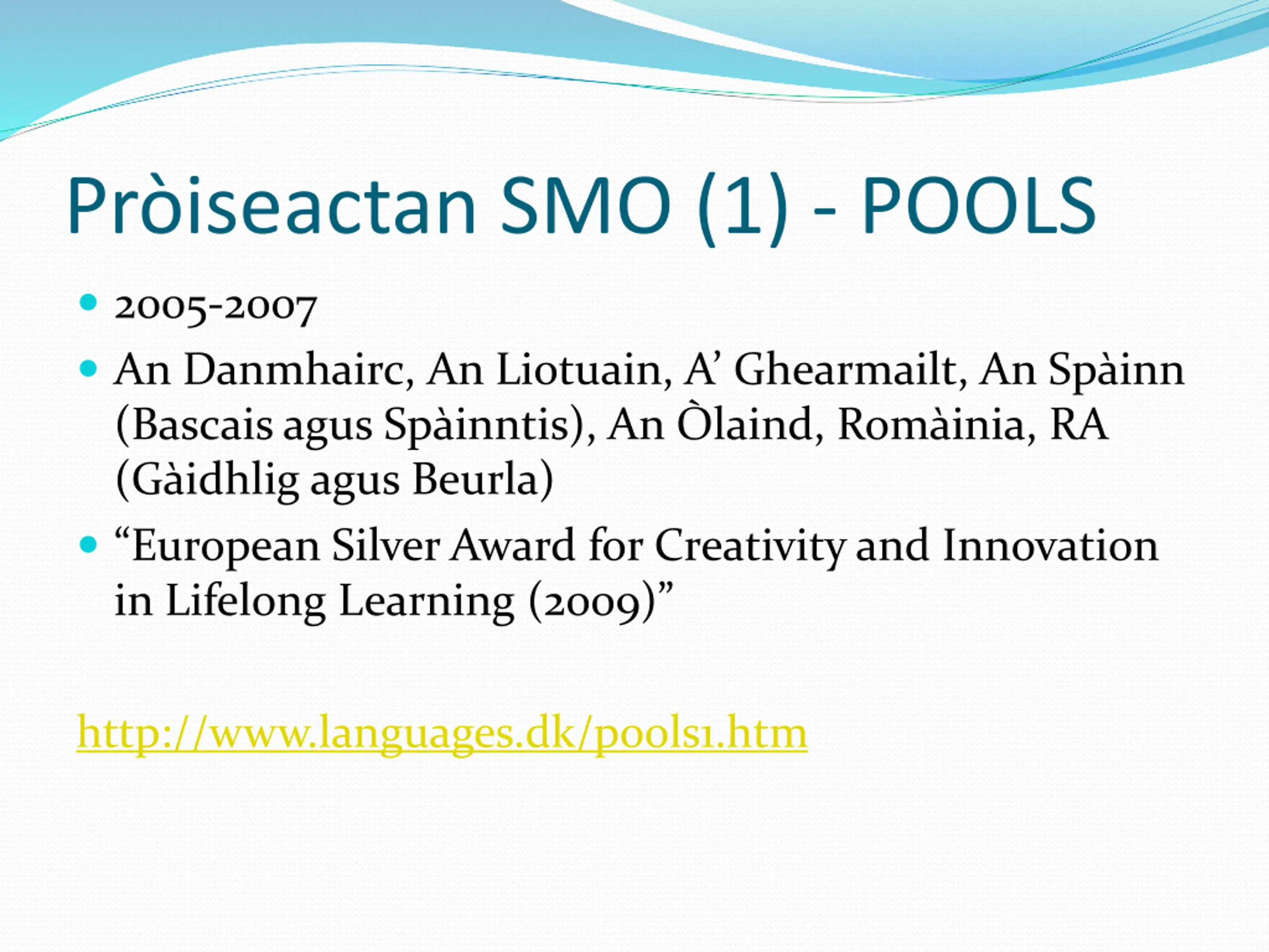 Priseactan SMO (1) - POOLS 2005-2007 An Danmhairc, An Liotuain, A Ghearmailt, An Sp inn (Bascais agus Sp inntis), An laind, Rom inia, RA (G idhlig agus Beurla) European Silver Award for Creativity and Innovation in Lifelong Learning (2009) http://www.languages.dk/pools1.htm