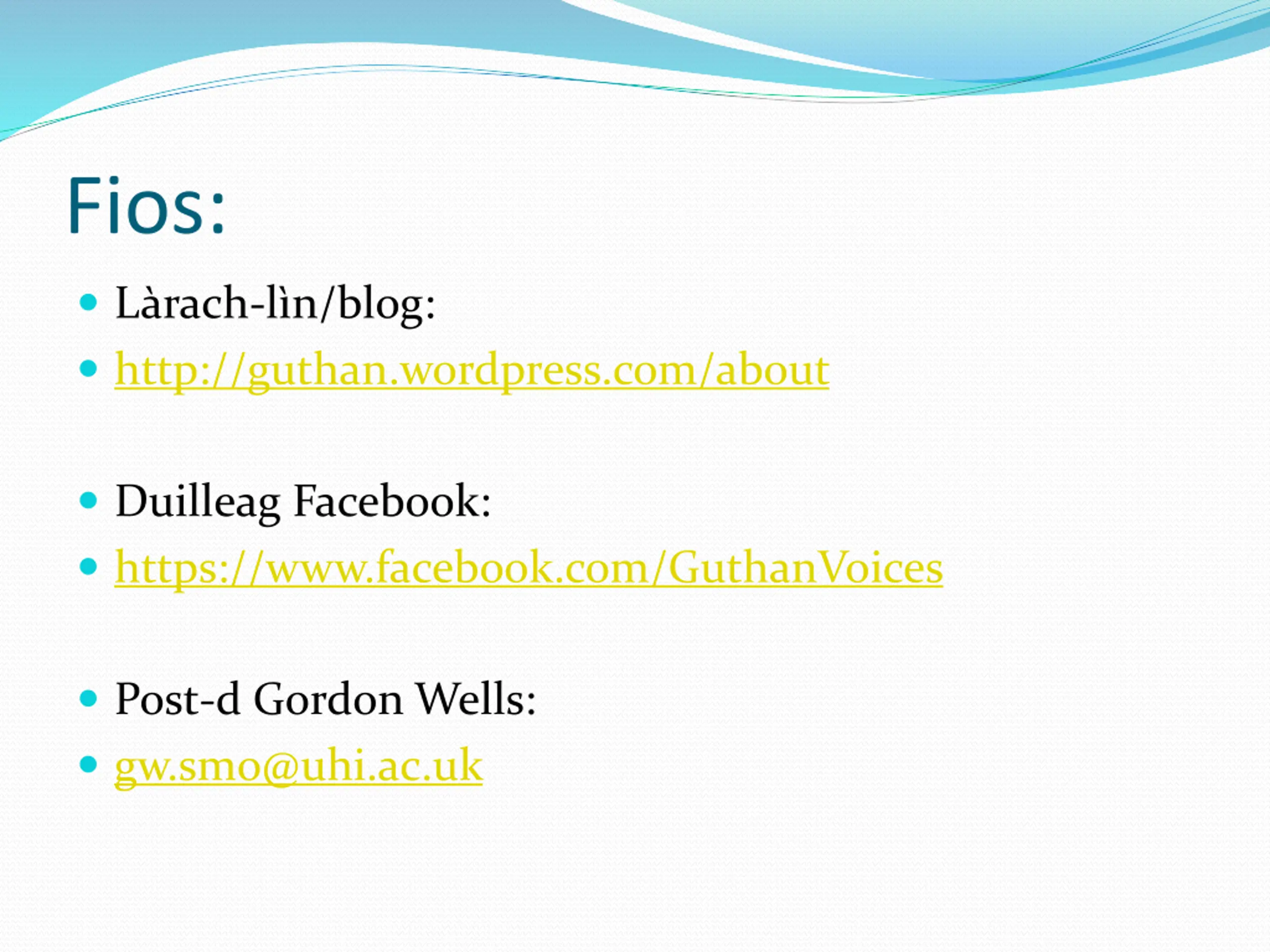 Fios: L rach-l n/blog: http://guthan.wordpress.com/about Duilleag Facebook: https://www.facebook.com/GuthanVoices Post-d Gordon Wells: gw.smo@uhi.ac.uk