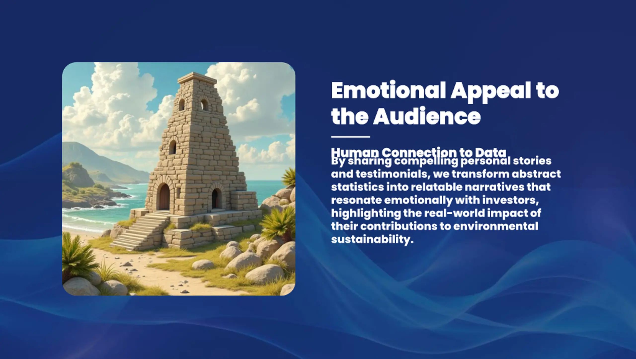 Emotional Appeal to Emotional Appeal to the Audience the Audience Human Connection to Data Human Connection to Data By sharing compelling personal stories and testimonials, we transform abstract statistics into relatable narratives that resonate emotionally with investors, highlighting the real-world impact of their contributions to environmental sustainability.