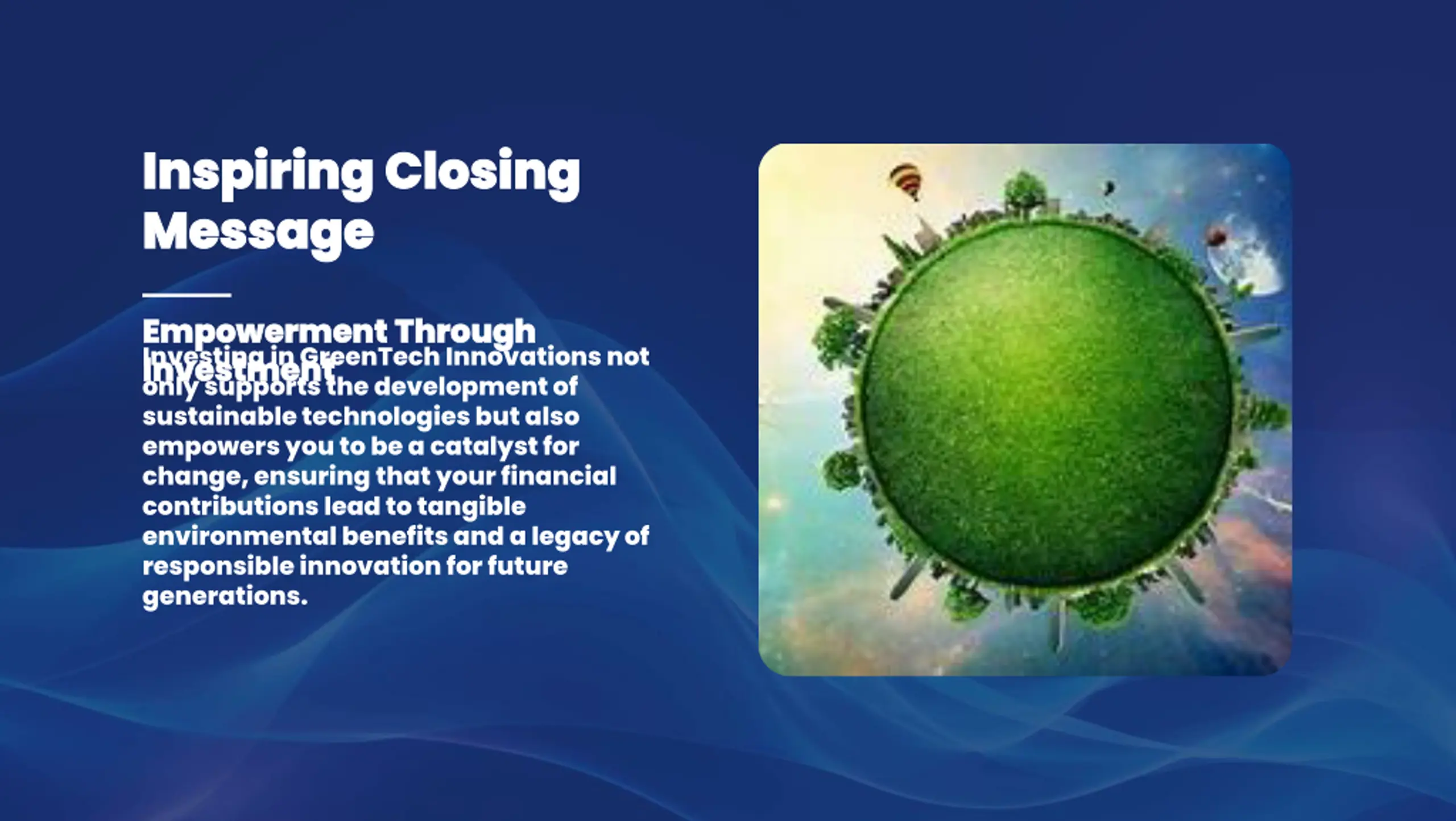 Inspiring Closing Inspiring Closing Message Message Empowerment Through Empowerment Through Investment Investment only supports the development of sustainable technologies but also empowers you to be a catalyst for change, ensuring that your financial contributions lead to tangible environmental benefits and a legacy of responsible innovation for future generations. Investing in GreenTech Innovations not