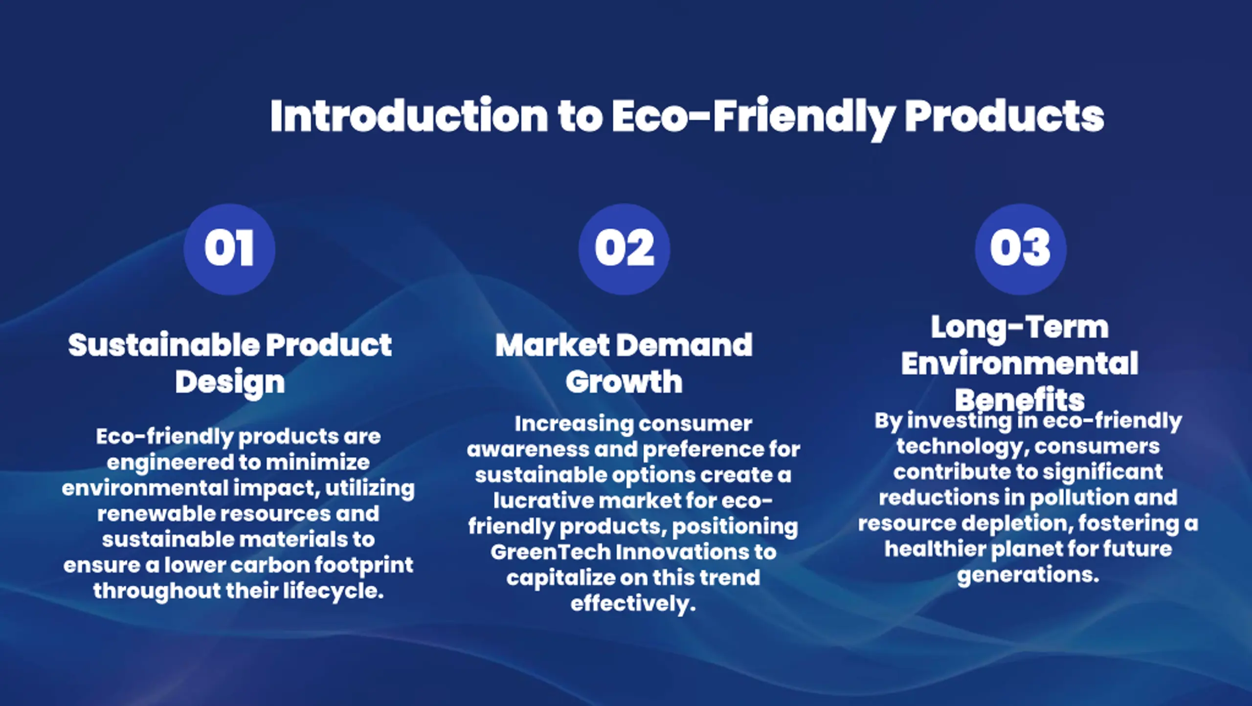 Introduction to Eco Introduction to Eco- -Friendly Products Friendly Products 01 01 02 02 03 03 Long Long- -Term Environmental Environmental Benefits Benefits By investing in eco-friendly technology, consumers contribute to significant reductions in pollution and resource depletion, fostering a healthier planet for future generations. Term Sustainable Product Sustainable Product Design Design Market Demand Market Demand Growth Growth Increasing consumer awareness and preference for sustainable options create a lucrative market for eco- friendly products, positioning GreenTech Innovations to capitalize on this trend effectively. Eco-friendly products are engineered to minimize environmental impact, utilizing renewable resources and sustainable materials to ensure a lower carbon footprint throughout their lifecycle.