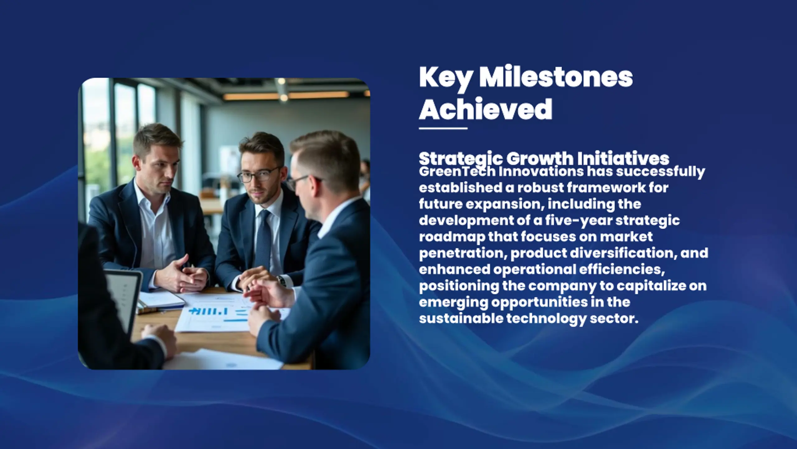 Key Milestones Key Milestones Achieved Achieved Strategic Growth Initiatives Strategic Growth Initiatives GreenTech Innovations has successfully established a robust framework for future expansion, including the development of a five-year strategic roadmap that focuses on market penetration, product diversification, and enhanced operational efficiencies, positioning the company to capitalize on emerging opportunities in the sustainable technology sector.