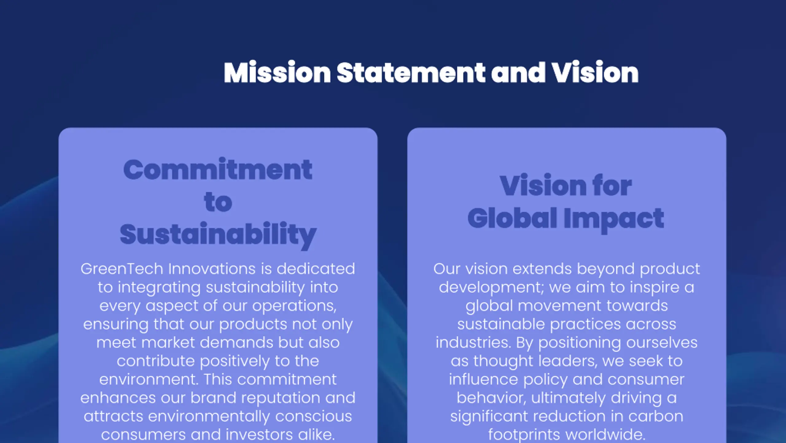 Mission Statement and Vision Mission Statement and Vision Commitment Commitment to to Sustainability Sustainability GreenTech Innovations is dedicated to integrating sustainability into every aspect of our operations, ensuring that our products not only meet market demands but also contribute positively to the environment. This commitment enhances our brand reputation and attracts environmentally conscious consumers and investors alike. Vision for Vision for Global Impact Global Impact Our vision extends beyond product development; we aim to inspire a global movement towards sustainable practices across industries. By positioning ourselves as thought leaders, we seek to influence policy and consumer behavior, ultimately driving a significant reduction in carbon footprints worldwide.