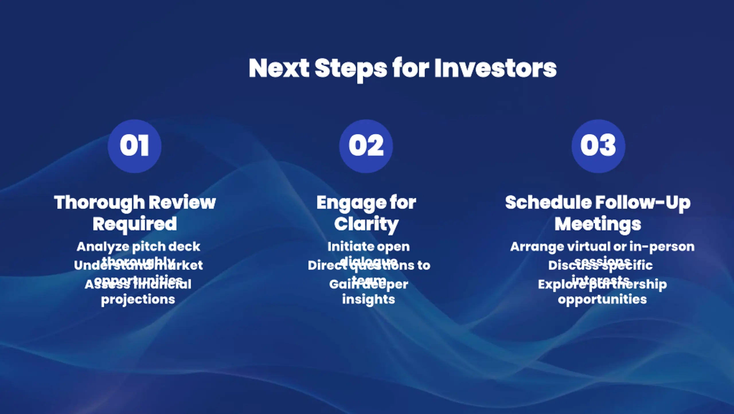 Next Steps for Investors Next Steps for Investors 01 01 02 02 03 03 Thorough Review Thorough Review Required Required Analyze pitch deck thoroughly Understand market opportunities Assess financial projections Engage for Engage for Clarity Clarity Initiate open dialogue Direct questions to team Gain deeper insights Schedule Follow Schedule Follow- -Up Meetings Meetings Arrange virtual or in-person sessions Discuss specific interests Explore partnership opportunities Up