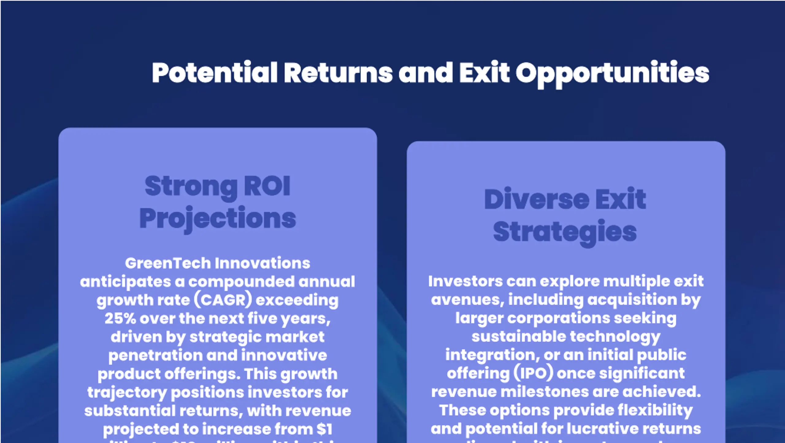 Potential Returns and Exit Opportunities Potential Returns and Exit Opportunities Strong ROI Strong ROI Projections Projections Diverse Exit Diverse Exit Strategies Strategies GreenTech Innovations anticipates a compounded annual growth rate (CAGR) exceeding 25% over the next five years, driven by strategic market penetration and innovative product offerings. This growth trajectory positions investors for substantial returns, with revenue projected to increase from $1 million to $10 million within this Investors can explore multiple exit avenues, including acquisition by larger corporations seeking sustainable technology integration, or an initial public offering (IPO) once significant revenue milestones are achieved. These options provide flexibility and potential for lucrative returns aligned with investor goals.