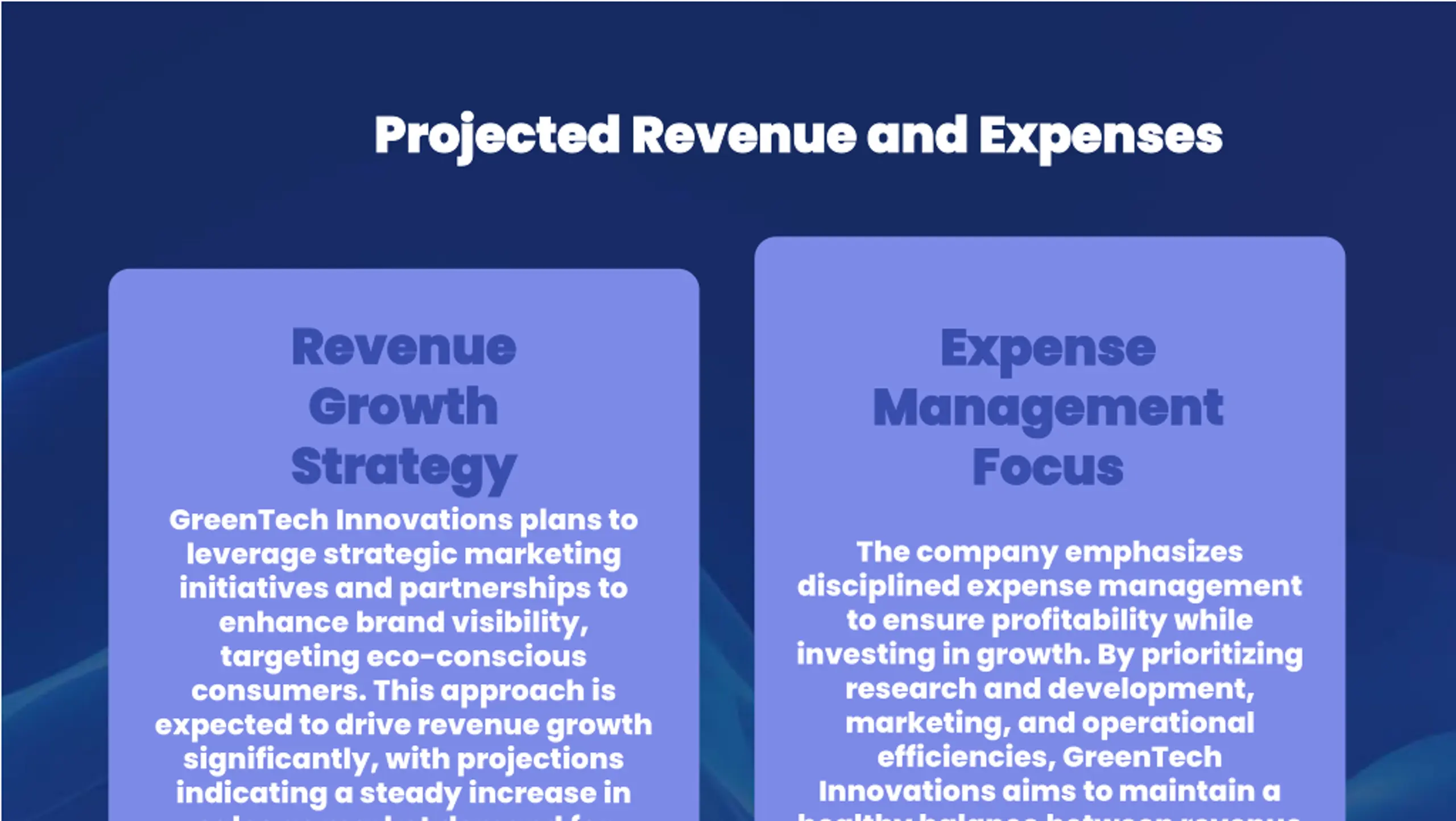 Projected Revenue and Expenses Projected Revenue and Expenses Revenue Revenue Growth Growth Strategy Strategy Expense Expense Management Management Focus Focus GreenTech Innovations plans to leverage strategic marketing initiatives and partnerships to enhance brand visibility, targeting eco-conscious consumers. This approach is expected to drive revenue growth significantly, with projections indicating a steady increase in sales as market demand for The company emphasizes disciplined expense management to ensure profitability while investing in growth. By prioritizing research and development, marketing, and operational efficiencies, GreenTech Innovations aims to maintain a healthy balance between revenue