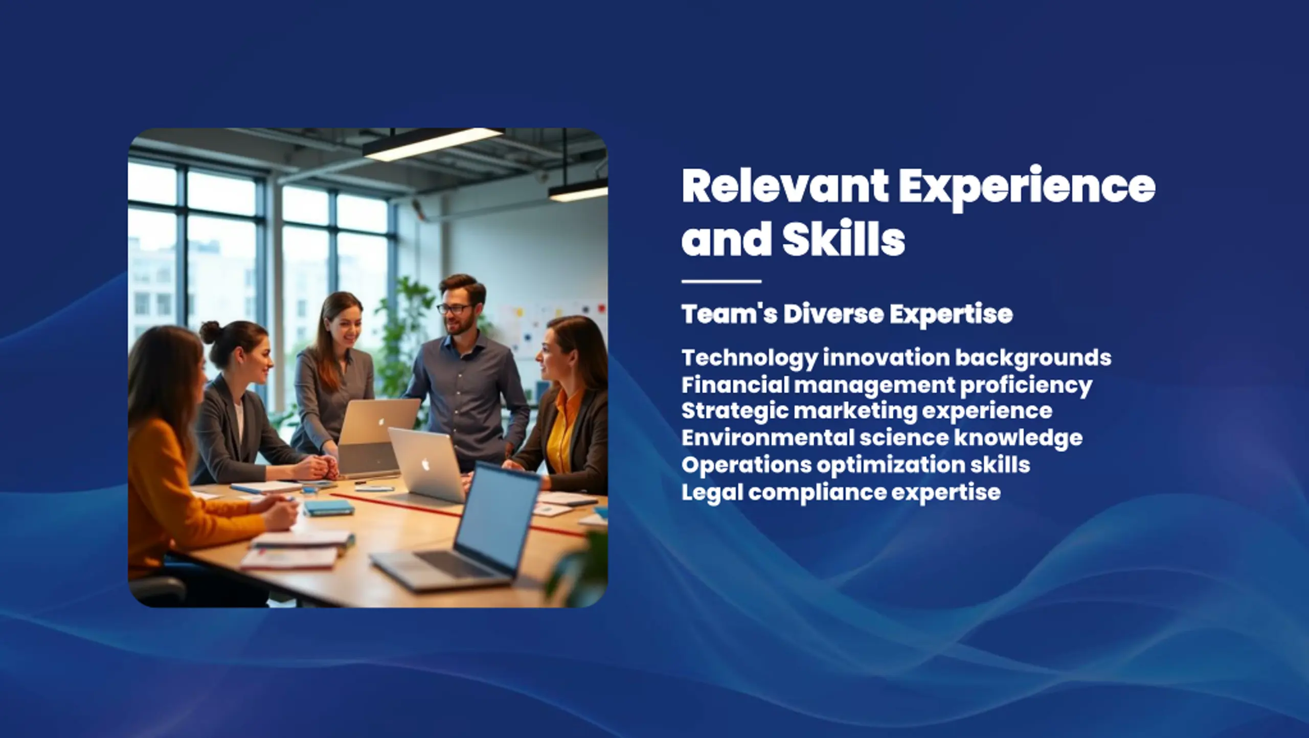Relevant Experience Relevant Experience and Skills and Skills Team's Diverse Expertise Team's Diverse Expertise Technology innovation backgrounds Financial management proficiency Strategic marketing experience Environmental science knowledge Operations optimization skills Legal compliance expertise