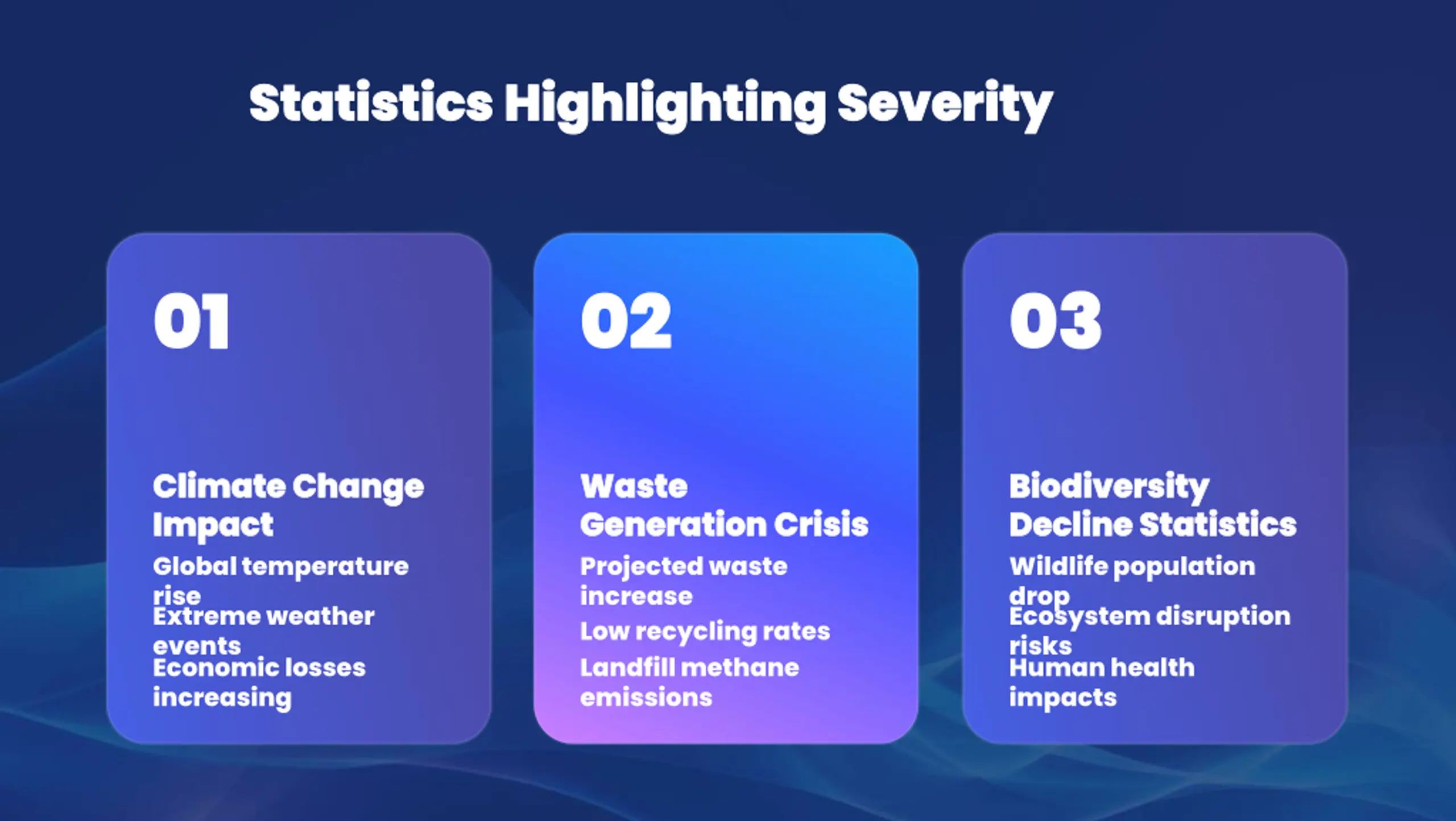 Statistics Highlighting Severity Statistics Highlighting Severity 01 01 02 02 03 03 Climate Change Climate Change Impact Impact Global temperature rise Extreme weather events Economic losses increasing Waste Waste Generation Crisis Generation Crisis Projected waste increase Low recycling rates Landfill methane emissions Biodiversity Biodiversity Decline Statistics Decline Statistics Wildlife population drop Ecosystem disruption risks Human health impacts