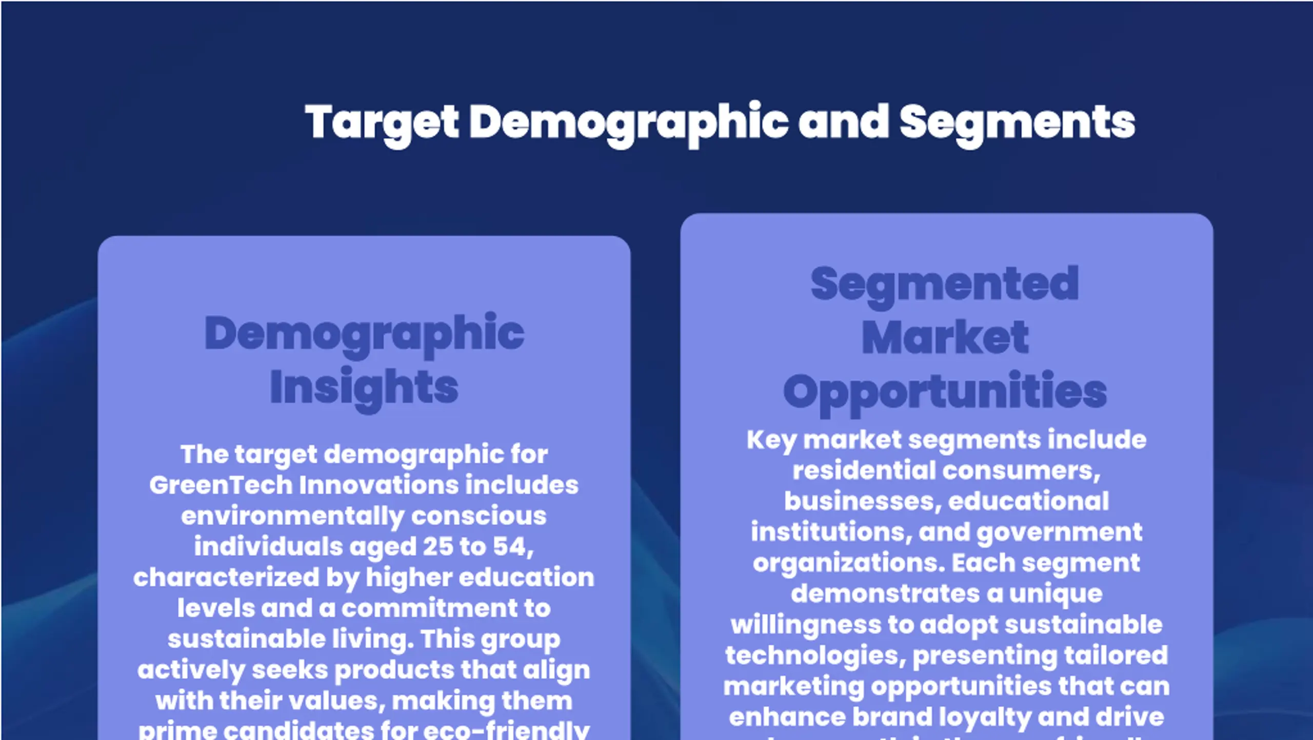 Target Demographic and Segments Target Demographic and Segments Segmented Segmented Market Market Opportunities Opportunities Key market segments include residential consumers, businesses, educational institutions, and government organizations. Each segment demonstrates a unique willingness to adopt sustainable technologies, presenting tailored marketing opportunities that can enhance brand loyalty and drive sales growth in the eco friendly Demographic Demographic Insights Insights The target demographic for GreenTech Innovations includes environmentally conscious individuals aged 25 to 54, characterized by higher education levels and a commitment to sustainable living. This group actively seeks products that align with their values, making them prime candidates for eco-friendly