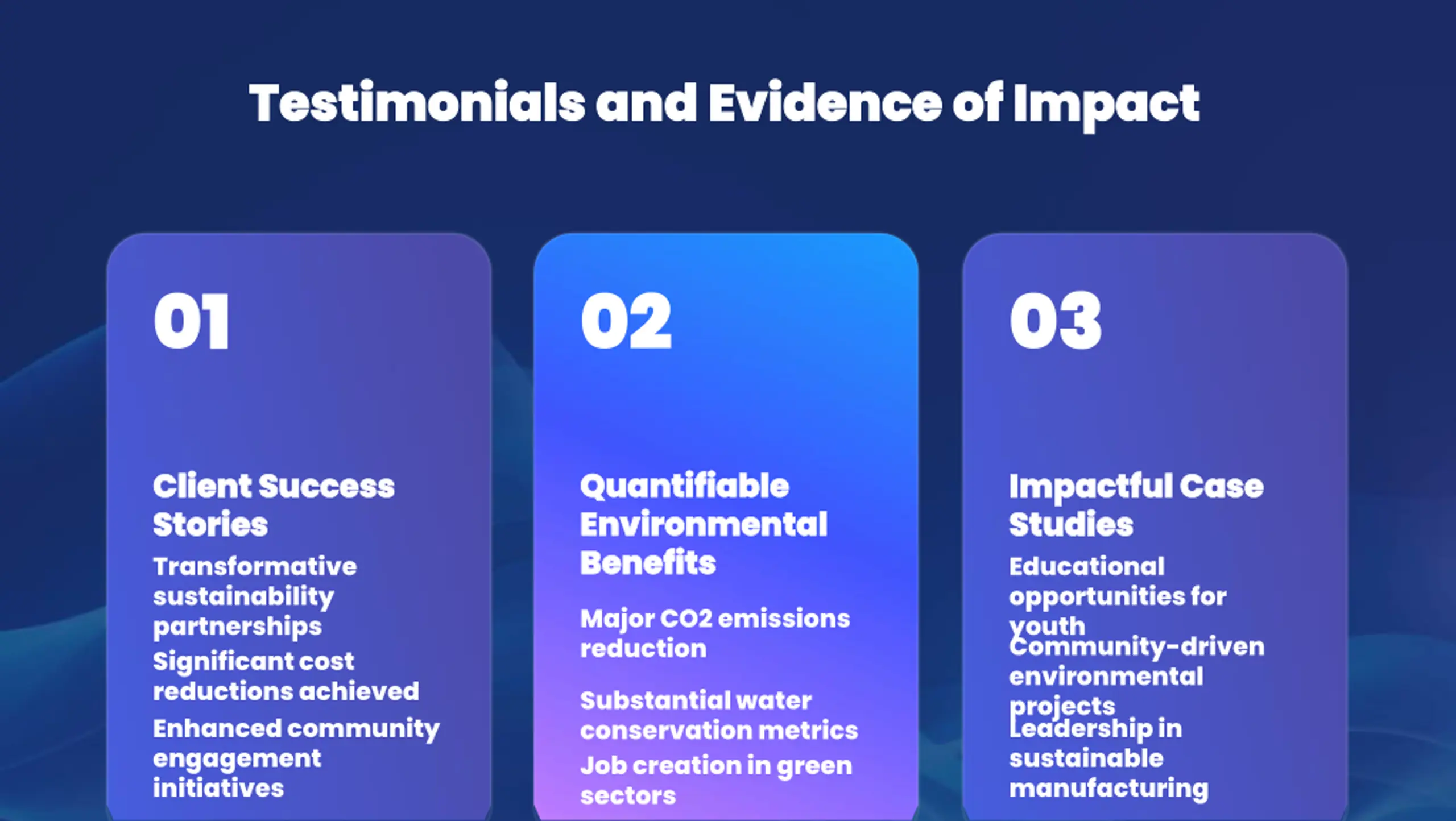 Testimonials and Evidence of Impact Testimonials and Evidence of Impact 01 01 02 02 03 03 Quantifiable Quantifiable Environmental Environmental Benefits Benefits Client Success Client Success Stories Stories Transformative sustainability partnerships Significant cost reductions achieved Enhanced community engagement initiatives Impactful Case Impactful Case Studies Studies Educational opportunities for youth Community-driven environmental projects Leadership in sustainable manufacturing Major CO2 emissions reduction Substantial water conservation metrics Job creation in green sectors