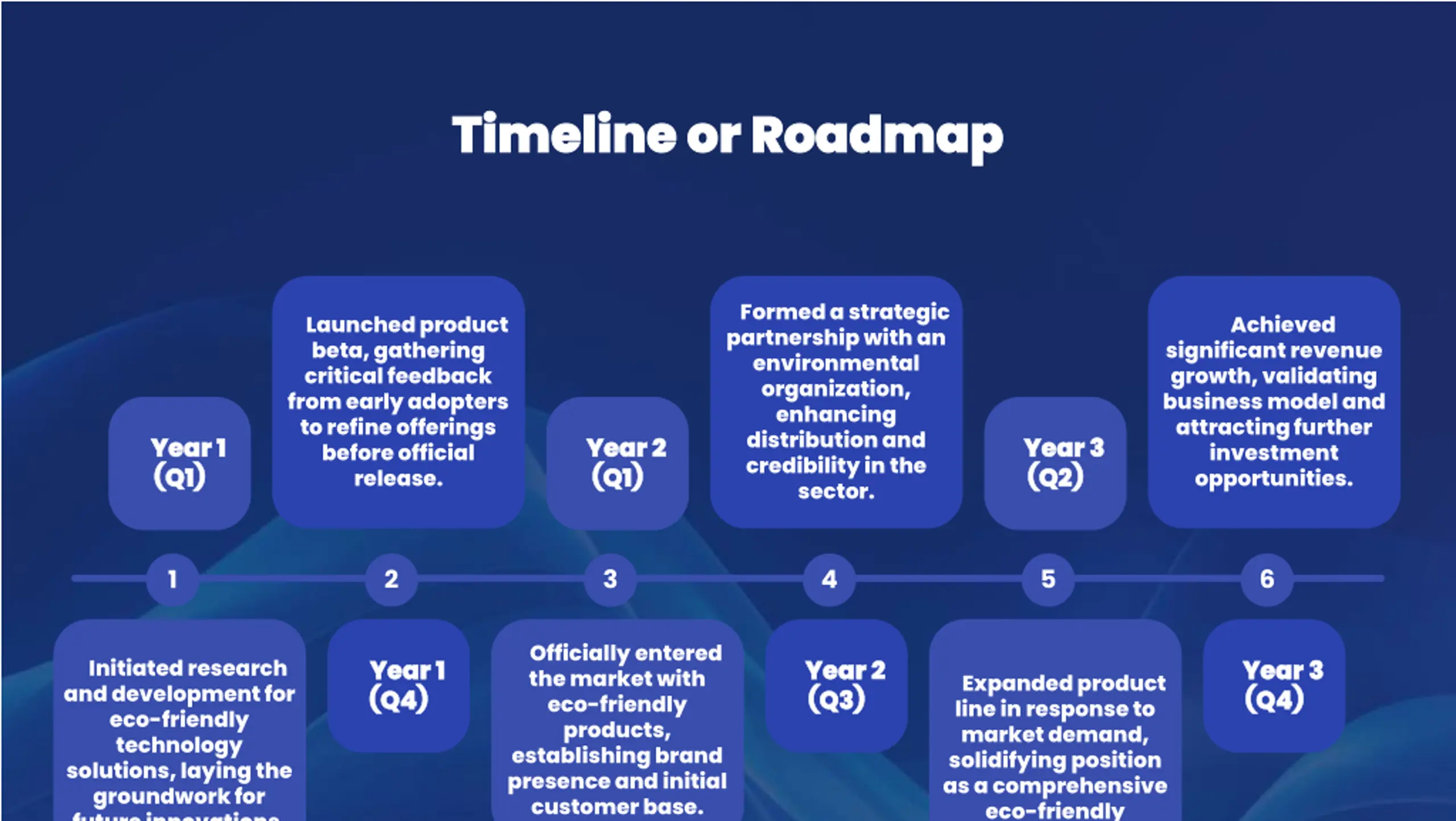 Timeline or Roadmap Timeline or Roadmap Formed a strategic partnership with an environmental organization, enhancing distribution and credibility in the sector. Launched product beta, gathering critical feedback from early adopters to refine offerings before official release. Achieved significant revenue growth, validating business model and attracting further investment opportunities. Year 1 Year 1 (Q1) (Q1) Year 2 Year 2 (Q1) (Q1) Year 3 Year 3 (Q2) (Q2) 1 2 3 4 5 6 Officially entered the market with eco-friendly products, establishing brand presence and initial customer base. Year 1 Year 1 (Q4) (Q4) Year 2 Year 2 (Q3) (Q3) Year 3 Year 3 (Q4) (Q4) Initiated research and development for eco-friendly technology solutions, laying the groundwork for future innovations. Expanded product line in response to market demand, solidifying position as a comprehensive eco-friendly