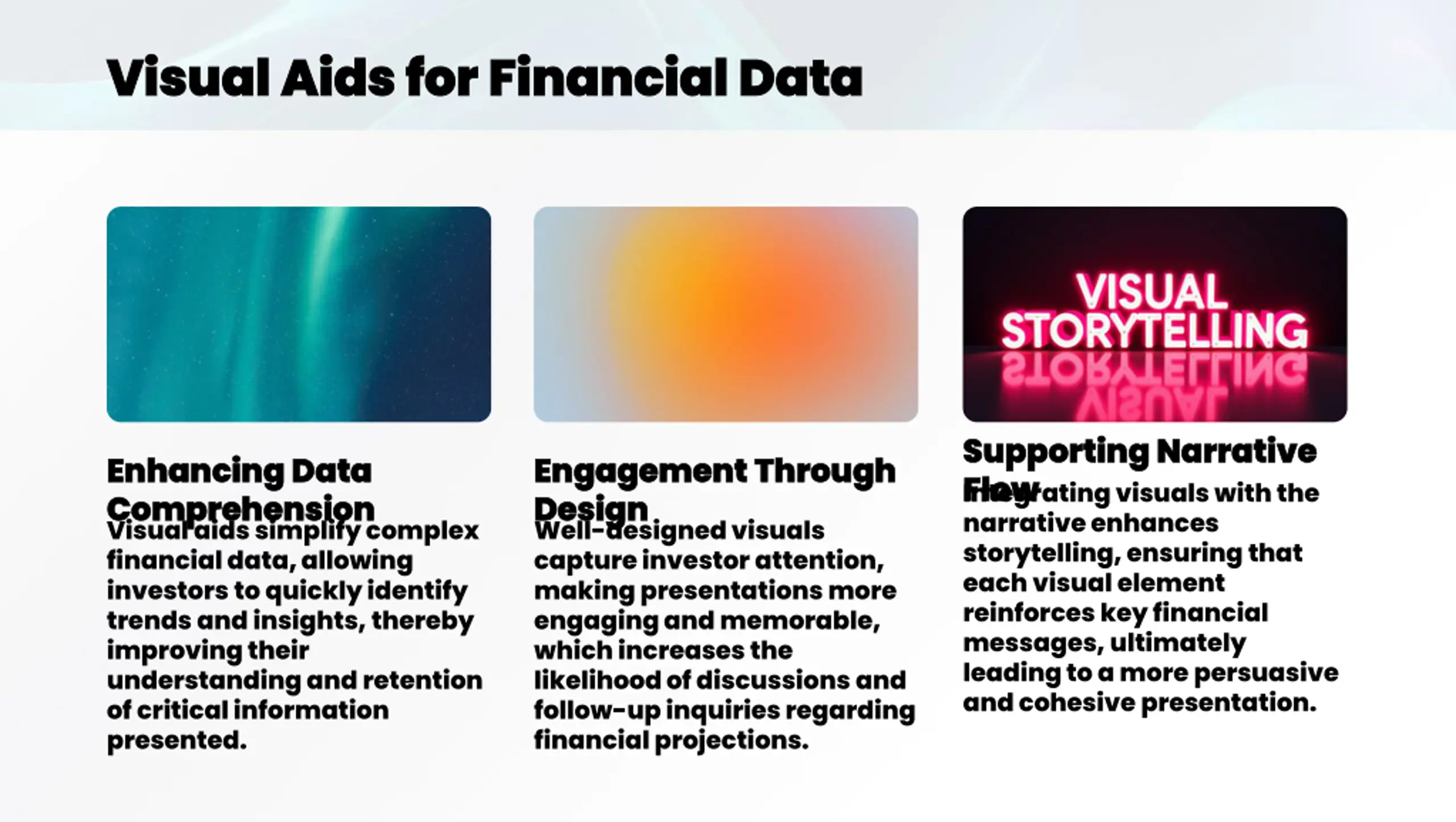 Visual Aids for Financial Data Visual Aids for Financial Data Supporting Narrative Supporting Narrative Flow Flow Integrating visuals with the narrative enhances storytelling, ensuring that each visual element reinforces key financial messages, ultimately leading to a more persuasive and cohesive presentation. Enhancing Data Enhancing Data Comprehension Comprehension Visual aids simplify complex financial data, allowing investors to quickly identify trends and insights, thereby improving their understanding and retention of critical information presented. Engagement Through Engagement Through Design Design Well-designed visuals capture investor attention, making presentations more engaging and memorable, which increases the likelihood of discussions and follow-up inquiries regarding financial projections.