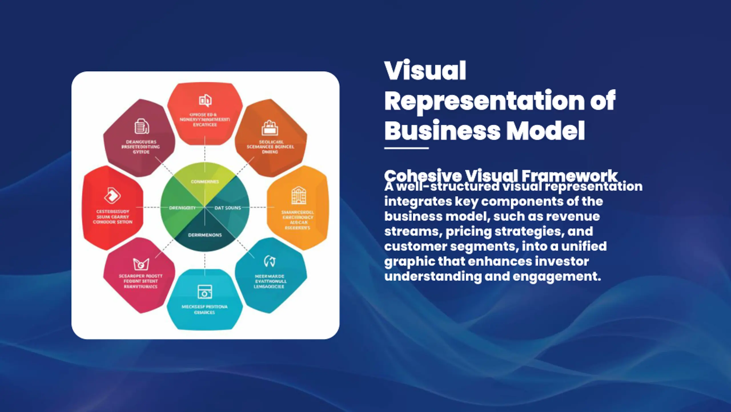 Visual Visual Representation of Representation of Business Model Business Model Cohesive Visual Framework Cohesive Visual Framework A well-structured visual representation integrates key components of the business model, such as revenue streams, pricing strategies, and customer segments, into a unified graphic that enhances investor understanding and engagement.
