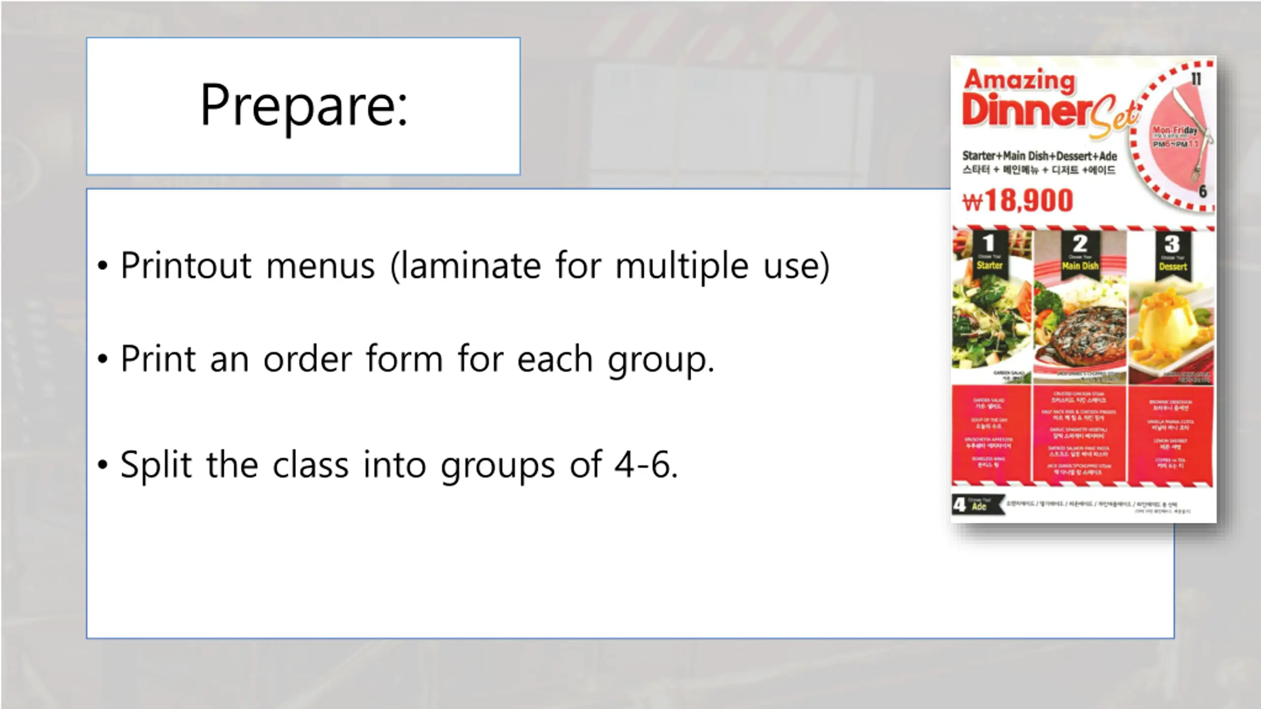 Prepare: Printout menus (laminate for multiple use) Print an order form for each group. Split the class into groups of 4-6.