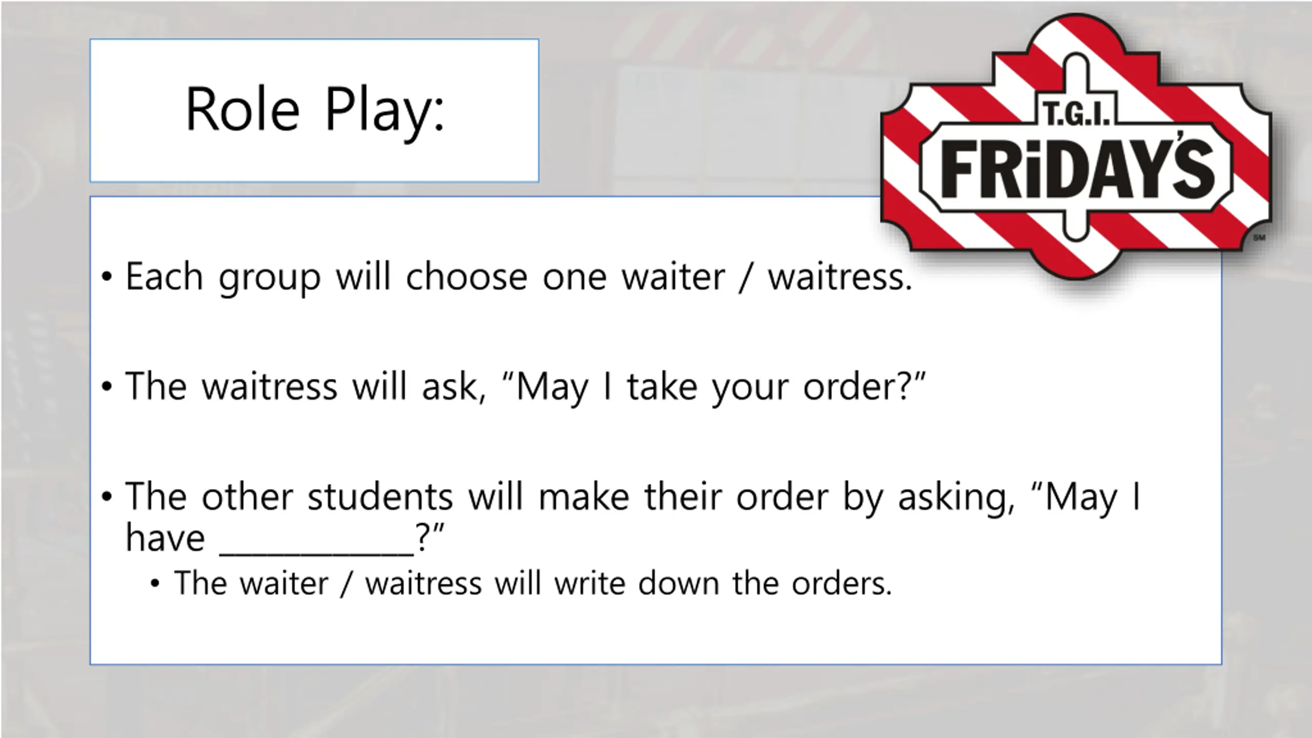 Role Play: Each group will choose one waiter / waitress. The waitress will ask, May I take your order? The other students will make their order by asking, May I have ____________? The waiter / waitress will write down the orders.