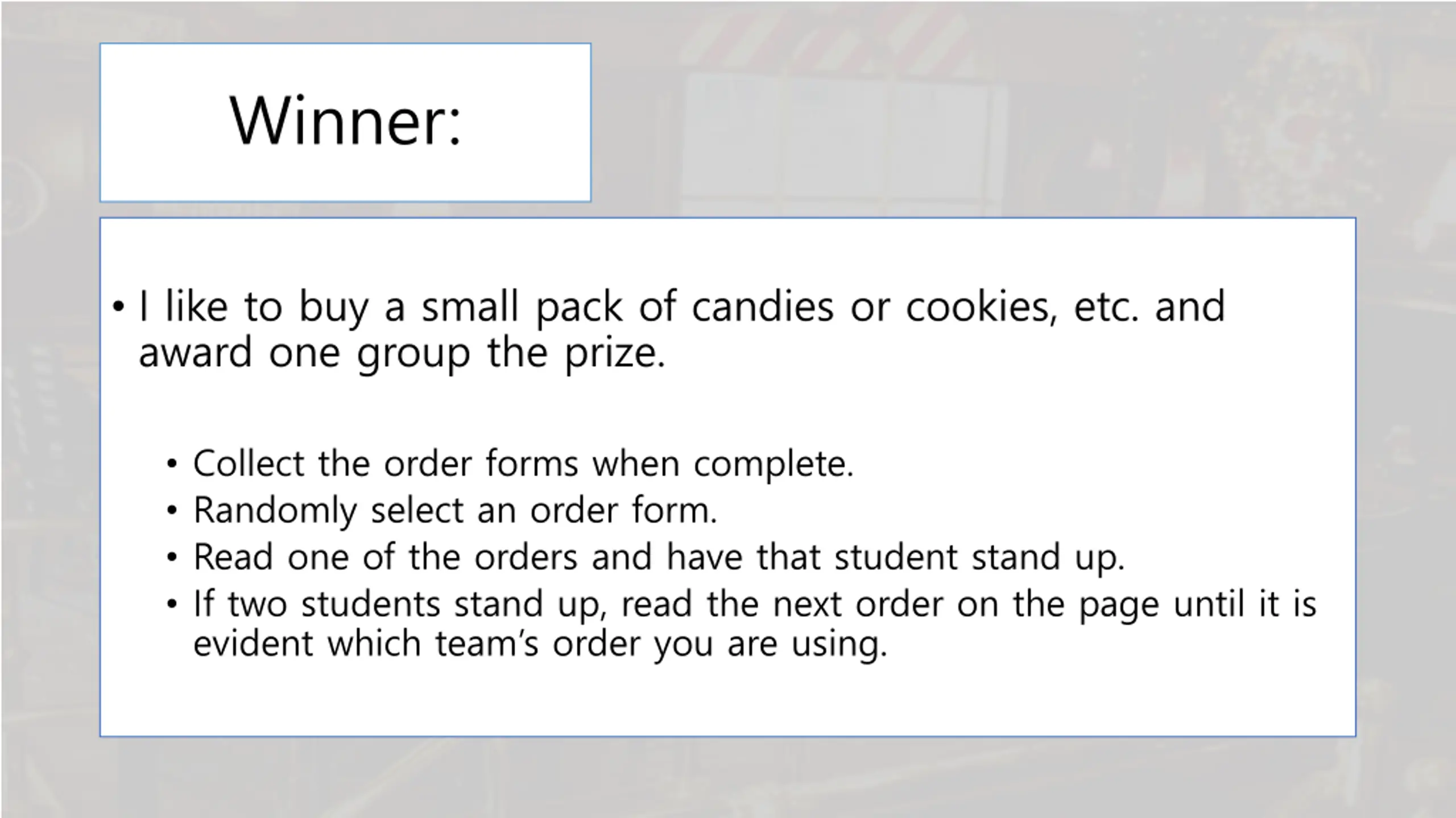 Winner: I like to buy a small pack of candies or cookies, etc. and award one group the prize. Collect the order forms when complete. Randomly select an order form. Read one of the orders and have that student stand up. If two students stand up, read the next order on the page until it is evident which team s order you are using.