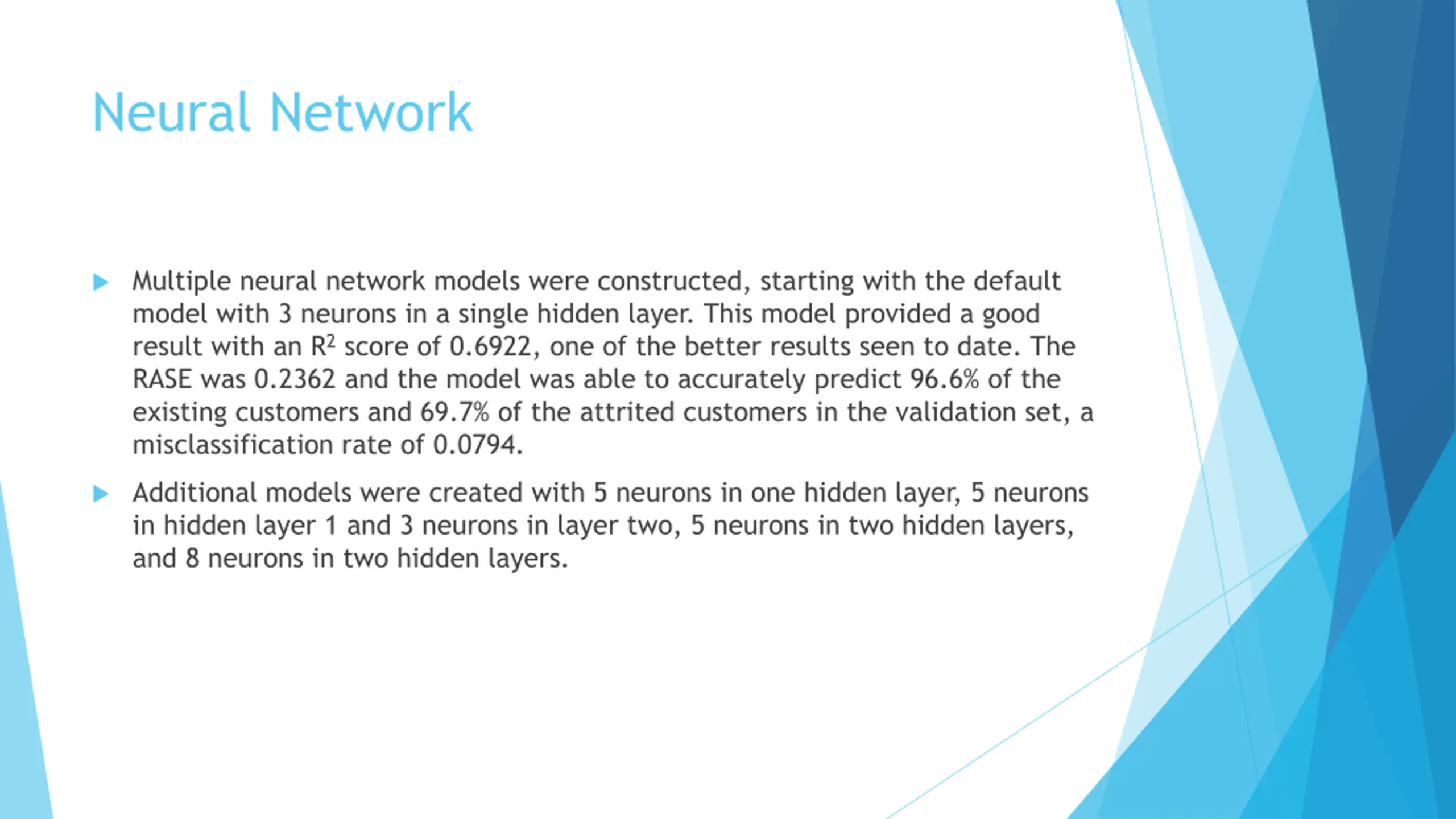 Neural Network Multiple neural network models were constructed, starting with the default model with 3 neurons in a single hidden layer. This model provided a good result with an R2 score of 0.6922, one of the better results seen to date. The RASE was 0.2362 and the model was able to accurately predict 96.6% of the existing customers and 69.7% of the attrited customers in the validation set, a misclassification rate of 0.0794. Additional models were created with 5 neurons in one hidden layer, 5 neurons in hidden layer 1 and 3 neurons in layer two, 5 neurons in two hidden layers, and 8 neurons in two hidden layers.