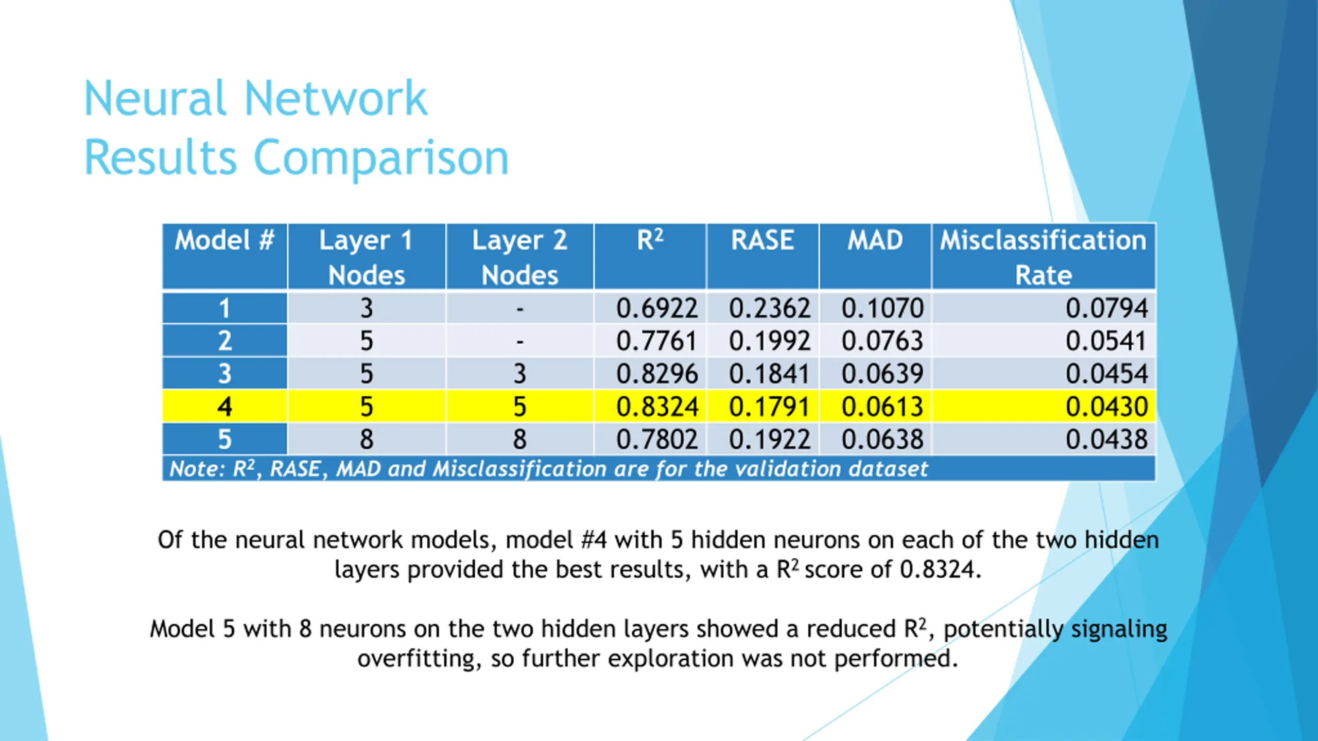 Neural Network Results Comparison Model # Layer 1 Nodes 3 5 5 5 8 Layer 2 Nodes - - 3 5 8 R2 RASE MAD Misclassification Rate 1 2 3 4 5 0.6922 0.7761 0.8296 0.8324 0.7802 0.2362 0.1992 0.1841 0.1791 0.1922 0.1070 0.0763 0.0639 0.0613 0.0638 0.0794 0.0541 0.0454 0.0430 0.0438 Note: R2, RASE, MAD and Misclassification are for the validation dataset Of the neural network models, model #4 with 5 hidden neurons on each of the two hidden layers provided the best results, with a R2 score of 0.8324. Model 5 with 8 neurons on the two hidden layers showed a reduced R2, potentially signaling overfitting, so further exploration was not performed.