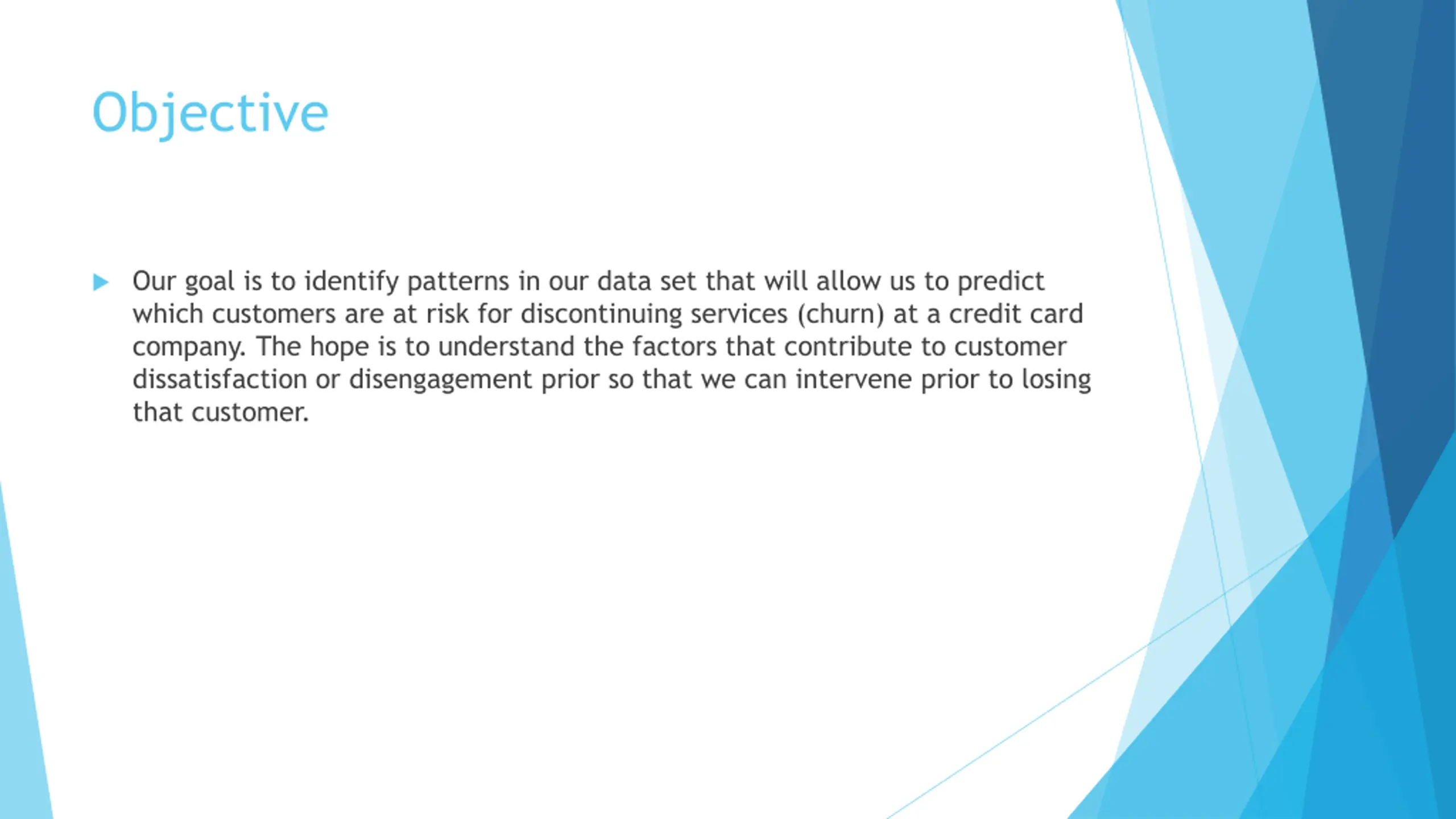 This project aims to identify patterns in customer data that predict churn risk at a credit card company. By analyzing customer demographics and behavior, we seek to understand factors contributing to dissatisfaction to intervene before losing customers. The dataset comprises 10,127 observations with 19 variables, focusing on attributes like age, income, and credit habits. Through logistic regression and principal component analysis, we aim to improve the accuracy of our predictive model and better retain valuable customers.