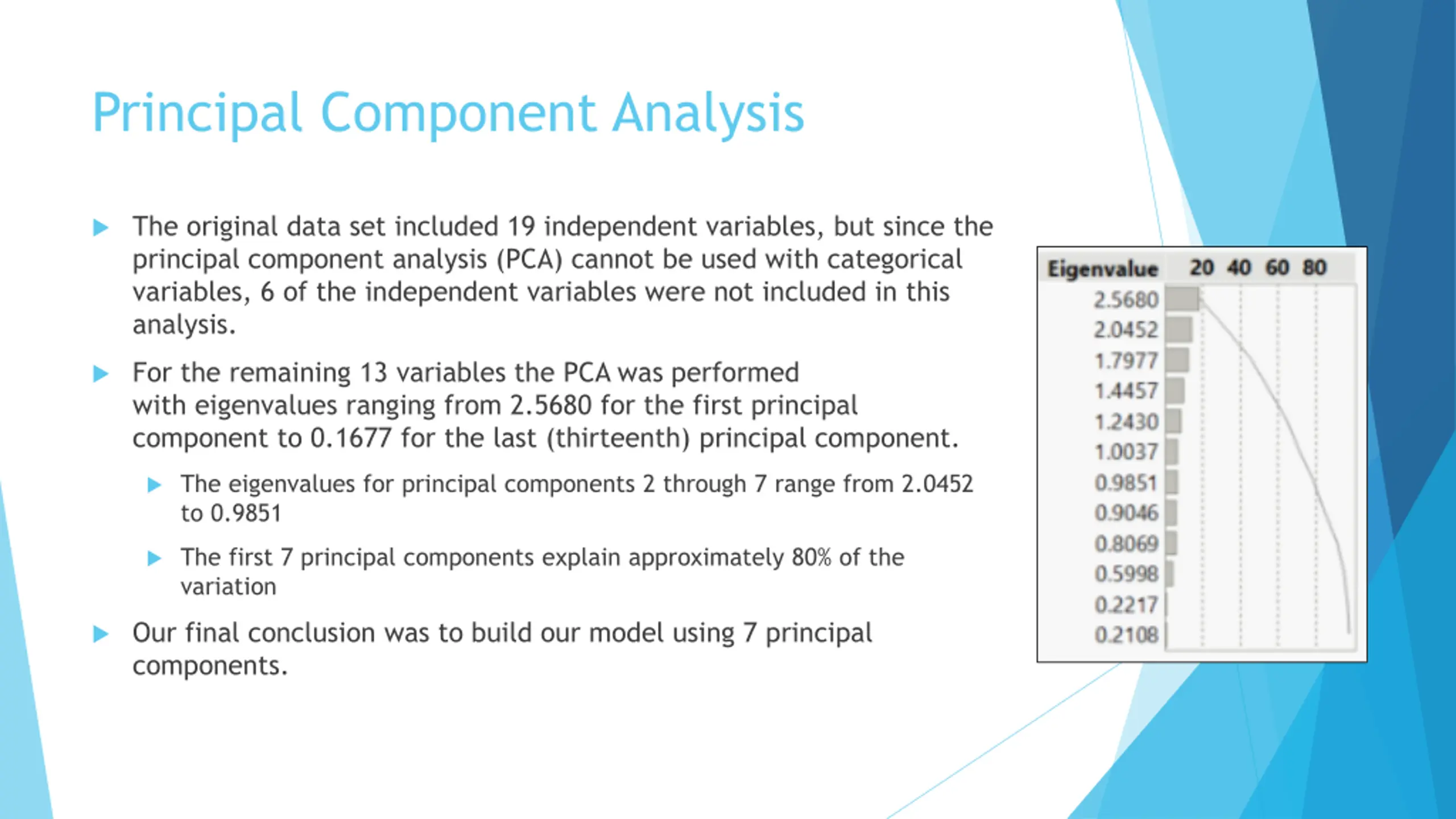 Principal Component Analysis The original data set included 19 independent variables, but since the principal component analysis (PCA) cannot be used with categorical variables, 6 of the independent variables were not included in this analysis. For the remaining 13 variables the PCA was performed with eigenvalues ranging from 2.5680 for the first principal component to 0.1677 for the last (thirteenth) principal component. The eigenvalues for principal components 2 through 7 range from 2.0452 to 0.9851 The first 7 principal components explain approximately 80% of the variation Our final conclusion was to build our model using 7 principal components.