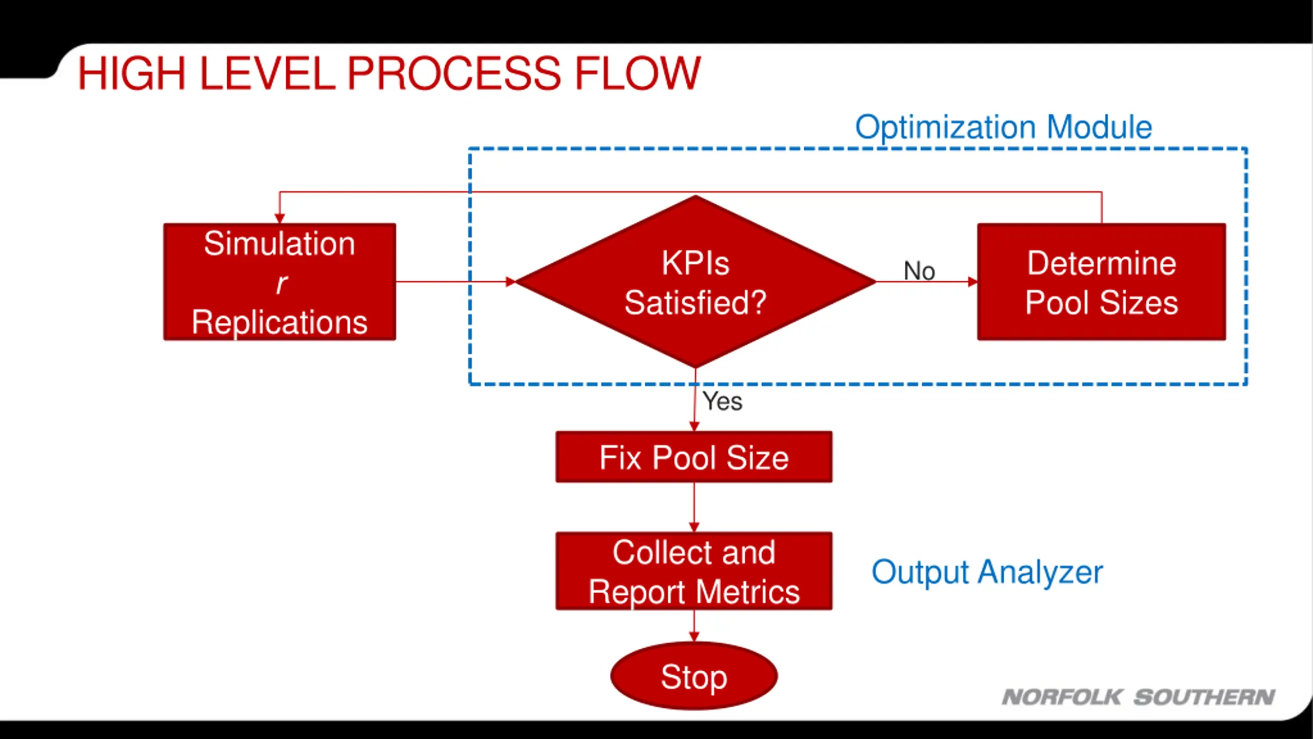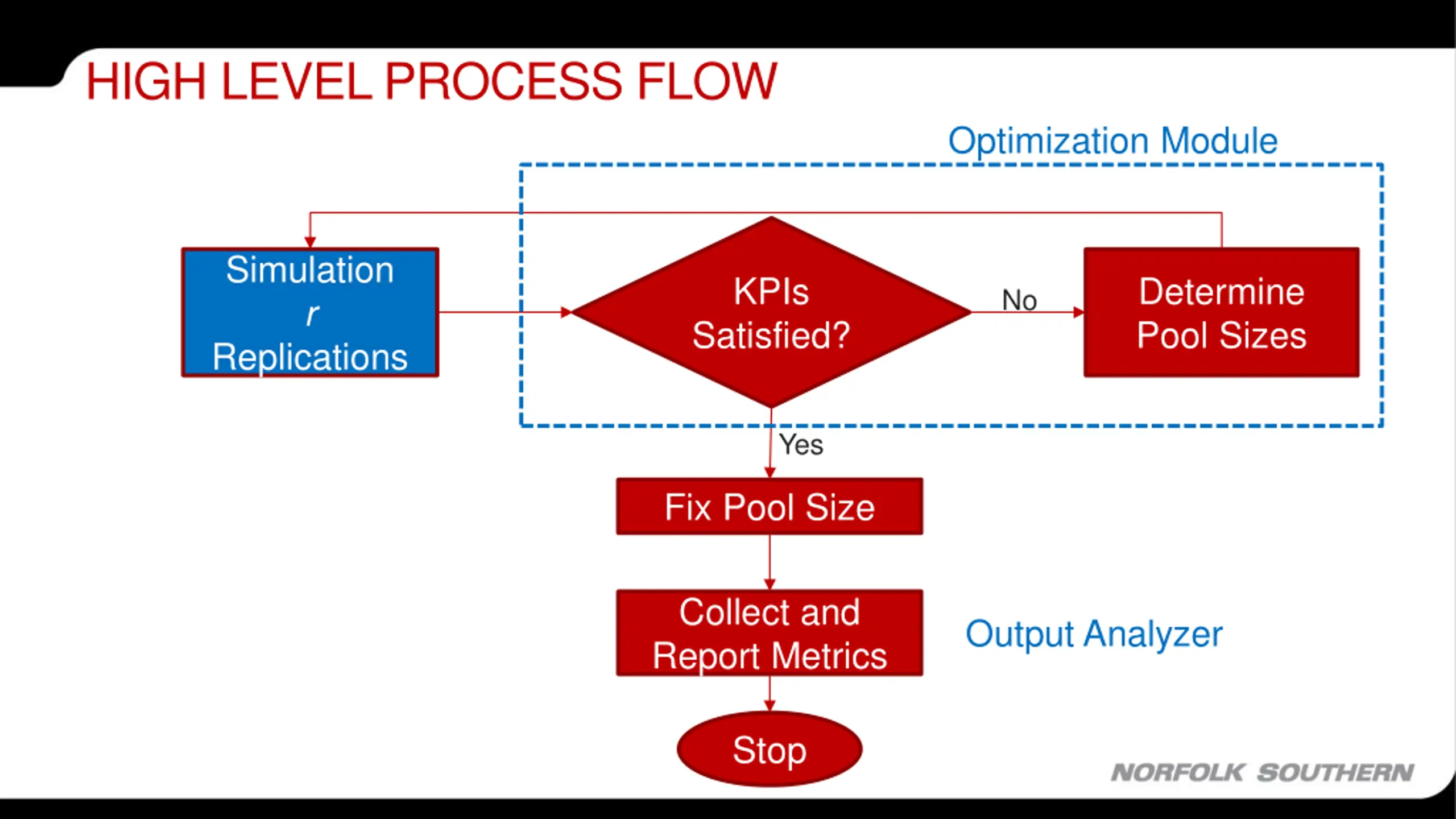 HIGH LEVEL PROCESS FLOW Optimization Module Simulation r Replications KPIs Satisfied? Determine Pool Sizes No Yes Fix Pool Size Collect and Report Metrics Output Analyzer Stop