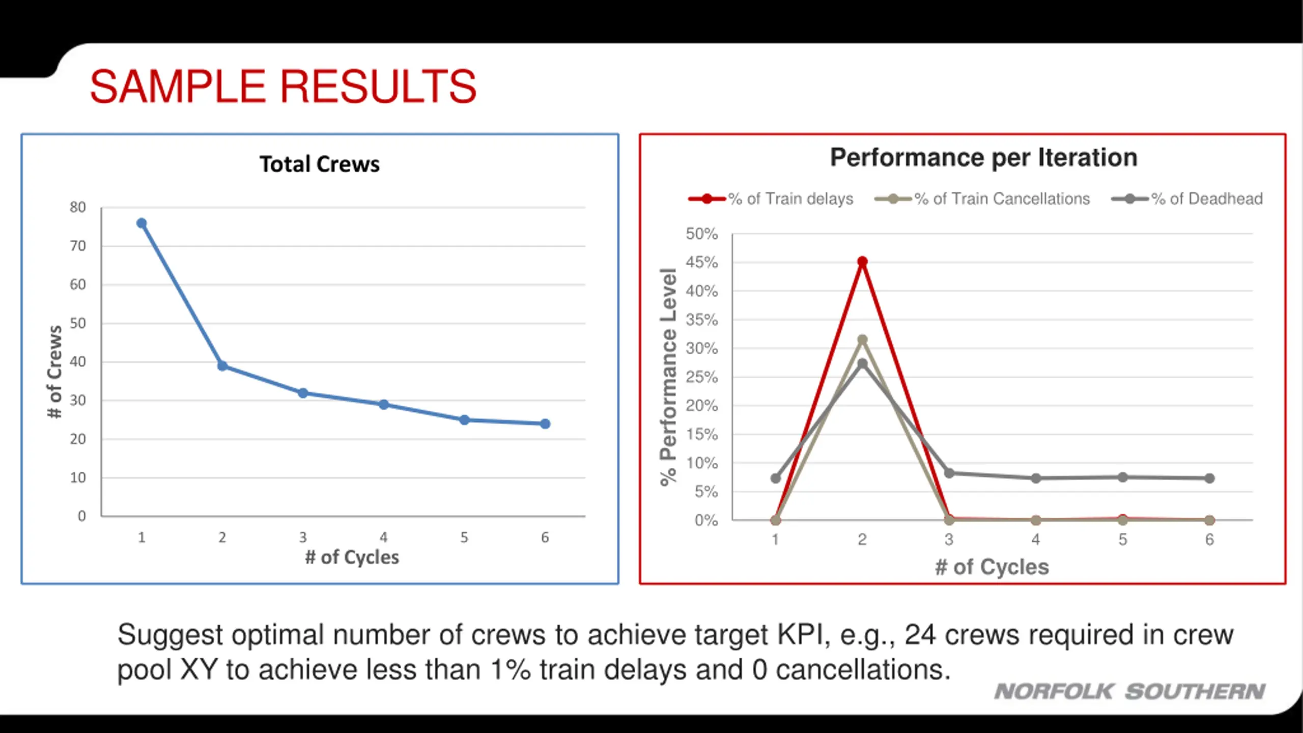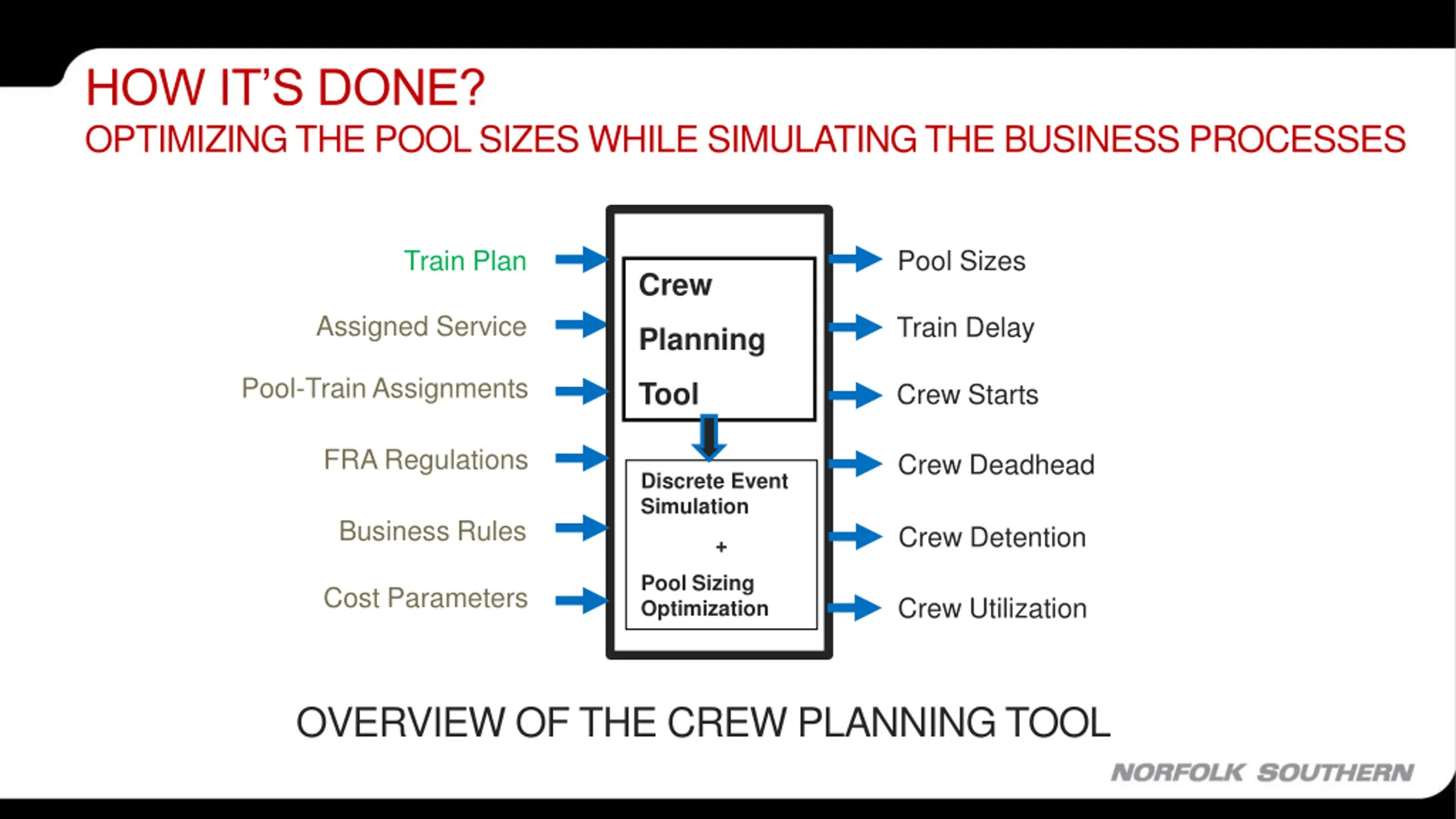 HOW ITS DONE? OPTIMIZING THE POOL SIZES WHILE SIMULATING THE BUSINESS PROCESSES Pool Sizes Train Plan Crew Assigned Service Train Delay Planning Pool-Train Assignments Tool Crew Starts FRA Regulations Crew Deadhead Discrete Event Simulation Business Rules Crew Detention + Pool Sizing Optimization Cost Parameters Crew Utilization OVERVIEW OF THE CREW PLANNING TOOL
