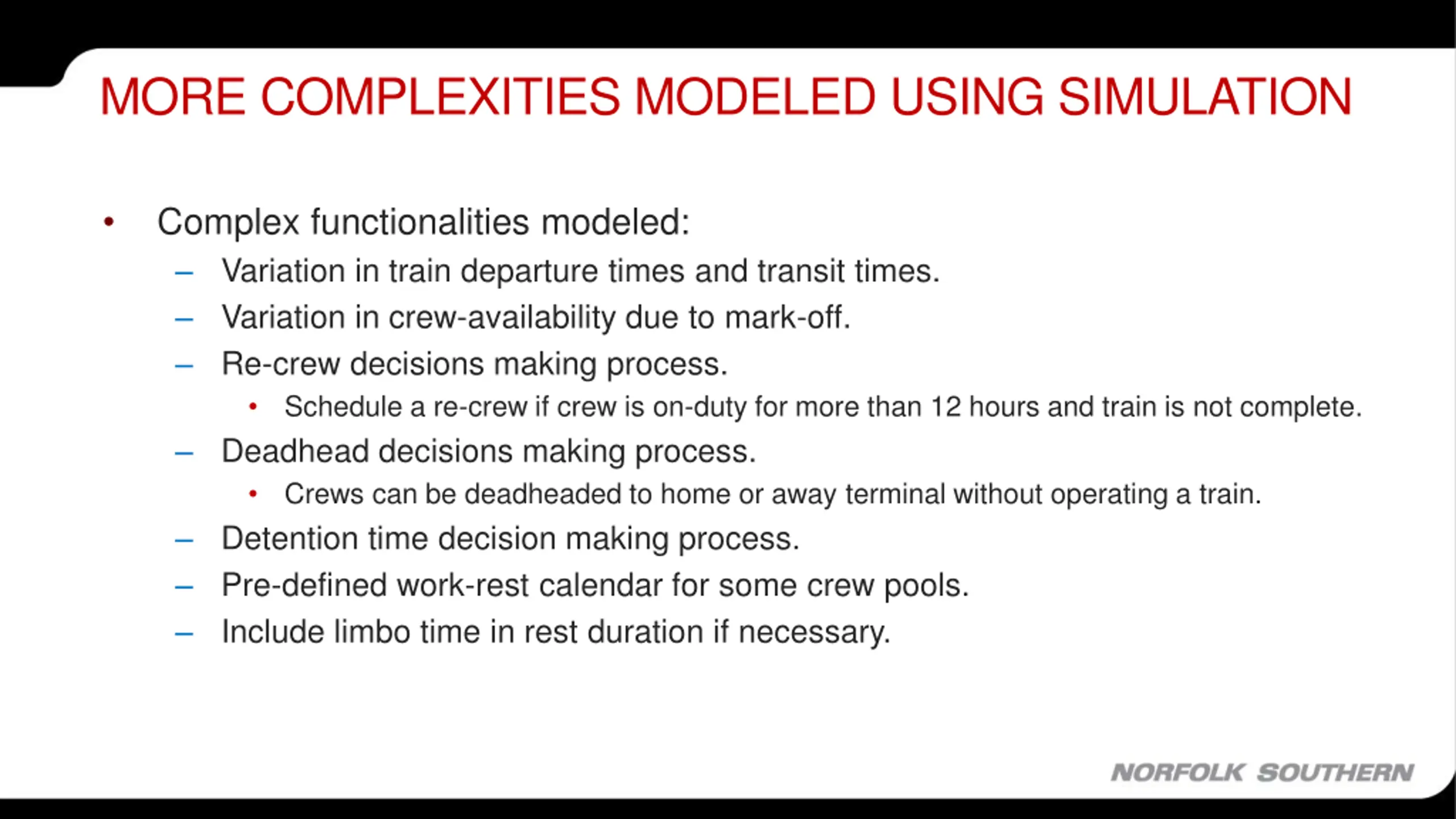 MORE COMPLEXITIES MODELED USING SIMULATION Complex functionalities modeled: Variation in train departure times and transit times. Variation in crew-availability due to mark-off. Re-crew decisions making process. Schedule a re-crew if crew is on-duty for more than 12 hours and train is not complete. Deadhead decisions making process. Crews can be deadheaded to home or away terminal without operating a train. Detention time decision making process. Pre-defined work-rest calendar for some crew pools. Include limbo time in rest duration if necessary.