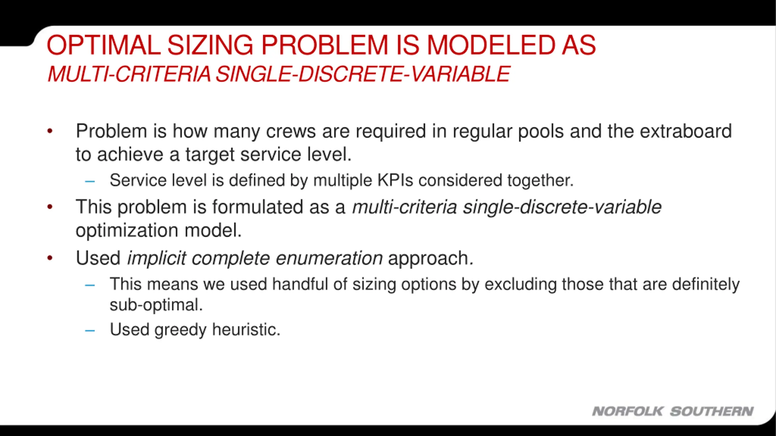 OPTIMAL SIZING PROBLEM IS MODELED AS MULTI-CRITERIA SINGLE-DISCRETE-VARIABLE Problem is how many crews are required in regular pools and the extraboard to achieve a target service level. Service level is defined by multiple KPIs considered together. This problem is formulated as a multi-criteria single-discrete-variable optimization model. Used implicit complete enumeration approach. This means we used handful of sizing options by excluding those that are definitely sub-optimal. Used greedy heuristic.