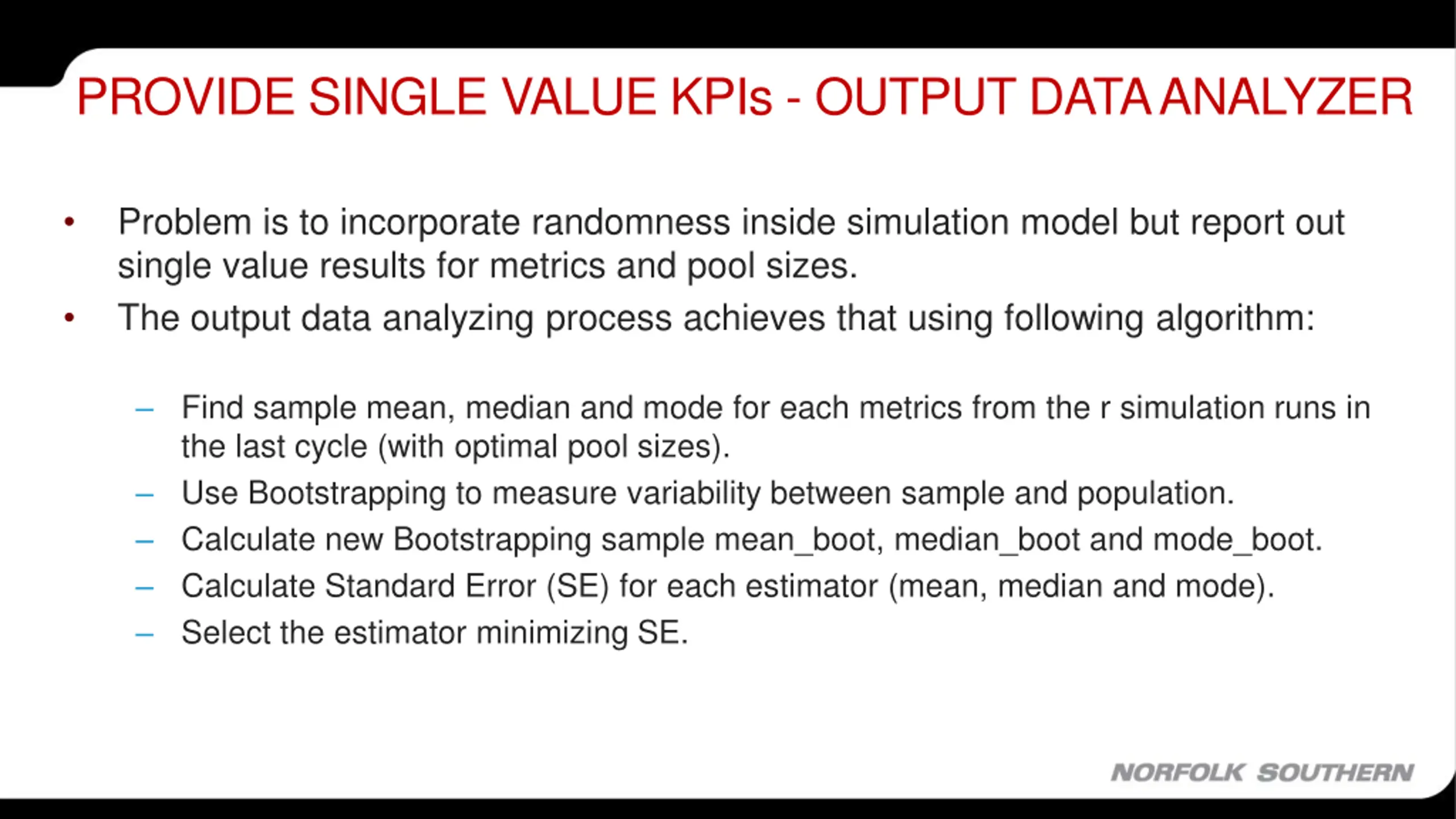PROVIDE SINGLE VALUE KPIs - OUTPUT DATA ANALYZER Problem is to incorporate randomness inside simulation model but report out single value results for metrics and pool sizes. The output data analyzing process achieves that using following algorithm: Find sample mean, median and mode for each metrics from the r simulation runs in the last cycle (with optimal pool sizes). Use Bootstrapping to measure variability between sample and population. Calculate new Bootstrapping sample mean_boot, median_boot and mode_boot. Calculate Standard Error (SE) for each estimator (mean, median and mode). Select the estimator minimizing SE.