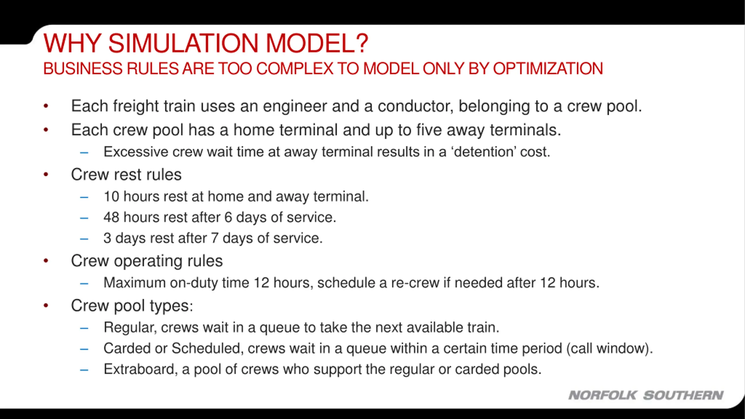 WHY SIMULATION MODEL? BUSINESS RULES ARE TOO COMPLEX TO MODEL ONLY BY OPTIMIZATION Each freight train uses an engineer and a conductor, belonging to a crew pool. Each crew pool has a home terminal and up to five away terminals. Excessive crew wait time at away terminal results in a detention cost. Crew rest rules 10 hours rest at home and away terminal. 48 hours rest after 6 days of service. 3 days rest after 7 days of service. Crew operating rules Maximum on-duty time 12 hours, schedule a re-crew if needed after 12 hours. Crew pool types: Regular, crews wait in a queue to take the next available train. Carded or Scheduled, crews wait in a queue within a certain time period (call window). Extraboard, a pool of crews who support the regular or carded pools.