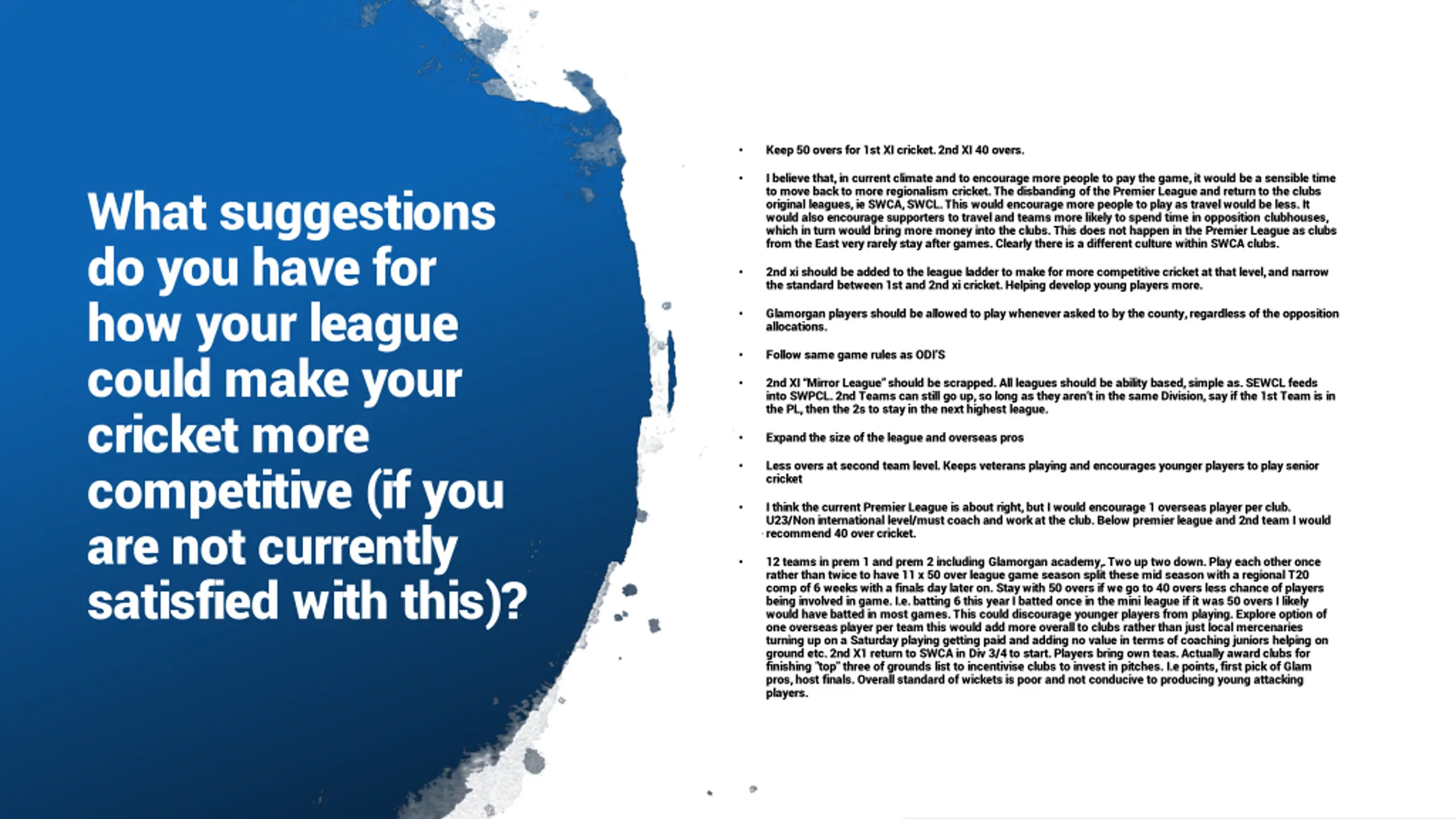 Keep 50 overs for 1st XI cricket. 2nd XI 40 overs. I believe that, in current climate and to encourage more people to pay the game, it would be a sensible time to move back to more regionalism cricket. The disbanding of the Premier League and return to the clubs original leagues, ie SWCA, SWCL. This would encourage more people to play as travel would be less. It would also encourage supporters to travel and teams more likely to spend time in opposition clubhouses, which in turn would bring more money into the clubs. This does not happen in the Premier League as clubs from the East very rarely stay after games. Clearly there is a different culture within SWCA clubs. What suggestions do you have for how your league could make your cricket more competitive (if you are not currently satisfied with this)? 2nd xi should be added to the league ladder to make for more competitive cricket at that level, and narrow the standard between 1st and 2nd xi cricket. Helping develop young players more. Glamorgan players should be allowed to play whenever asked to by the county, regardless of the opposition allocations. Follow same game rules as ODI S 2nd XI Mirror League should be scrapped. All leagues should be ability based, simple as. SEWCL feeds into SWPCL. 2nd Teams can still go up, so long as they aren t in the same Division, say if the 1st Team is in the PL, then the 2s to stay in the next highest league. Expand the size of the league and overseas pros Less overs at second team level. Keeps veterans playing and encourages younger players to play senior cricket I think the current Premier League is about right, but I would encourage 1 overseas player per club. U23/Non international level/must coach and work at the club. Below premier league and 2nd team I would recommend 40 over cricket. 12 teams in prem 1 and prem 2 including Glamorgan academy,. Two up two down. Play each other once rather than twice to have 11 x 50 over league game season split these mid season with a regional T20 comp of 6 weeks with a finals day later on. Stay with 50 overs if we go to 40 overs less chance of players being involved in game. I.e. batting 6 this year I batted once in the mini league if it was 50 overs I likely would have batted in most games. This could discourage younger players from playing. Explore option of one overseas player per team this would add more overall to clubs rather than just local mercenaries turning up on a Saturday playing getting paid and adding no value in terms of coaching juniors helping on ground etc. 2nd X1 return to SWCA in Div 3/4 to start. Players bring own teas. Actually award clubs for finishing "top" three of grounds list to incentivise clubs to invest in pitches. I.e points, first pick of Glam pros, host finals. Overall standard of wickets is poor and not conducive to producing young attacking players.